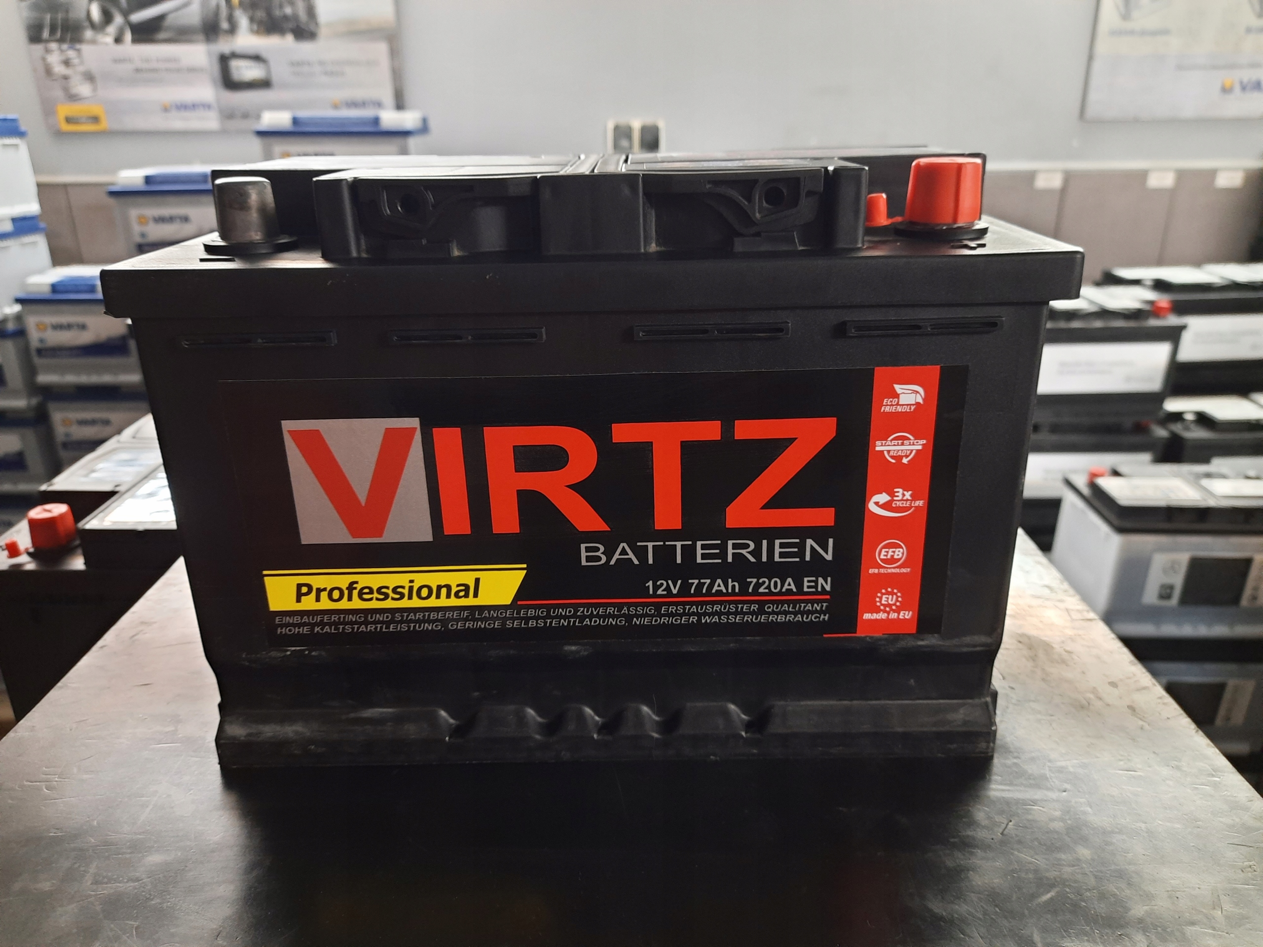 Аккумулятор VIRTZ PRO 12В/77Ач, пусковой ток 720А по стандарту EN, поляризация P+. Размеры: длина 278 мм, ширина 175 мм, высота 190 мм. Необслуживаемый аккумулятор, изготовленный по технологии EFB. Адаптирован для работы с базовой системой СТАРТ-СТОП без рекуперации энергии от тормозного усилия.Размер коробки: L3. Монтаж: B13