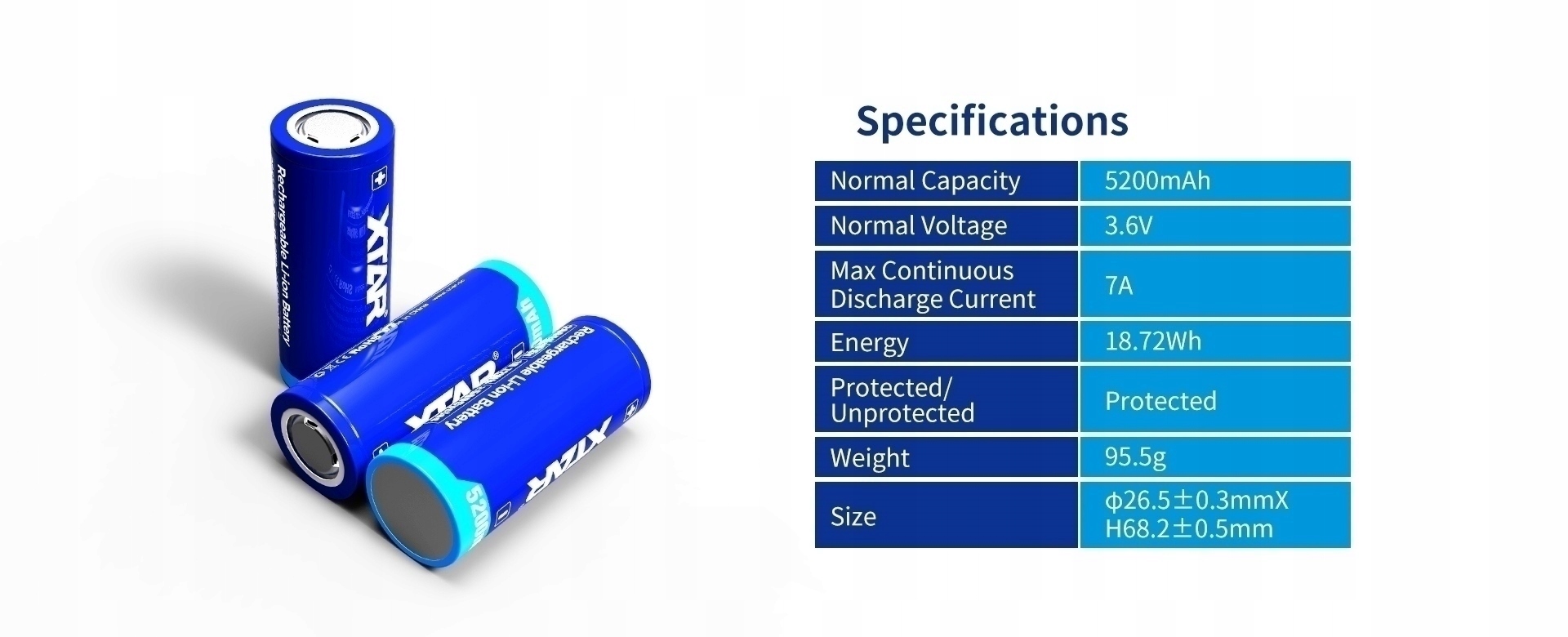 Аккумулятор XTAR 26650 5200 мАч с защитой PCM от разряда, перезаряда, перегрузки и короткого замыкания. При напряжении 3,7В. Аккумулятор выполнен по литий-ионной технологии. Обеспечивает большую плотность энергии. Специально разработан для фонарей.
