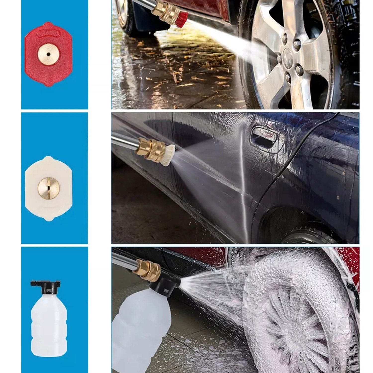 💦- Оснащен 3 различными насадками, красным прямым соплом высокого давления может смыть стойкие пятна, белая форсунка позволяет мыть большую площадь, а пенная лейка удобна для распыления под давлением.