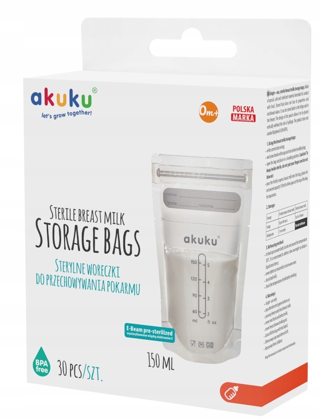 Одноразовые стерильные пакеты используются для хранения продуктов в холодильнике или их заморозки. Они соответствуют самым высоким гигиеническим стандартам благодаря стерилизации электронным лучом. Стабильное основание пакета обеспечивает удобное вертикальное хранение и защищает продукты от рассыпания. Плотная двойная застежка облегчает открытие и обеспечивает сохранность хранящихся продуктов, защищая при этом от проникновения запахов. Благодаря мерному стаканчику, размещенному на пакете, вы сможете точно отмерить необходимое количество молока, а на белой этикетке, размещенной на пакете, можно написать пометку о дате, времени и количестве сцеженного молока.