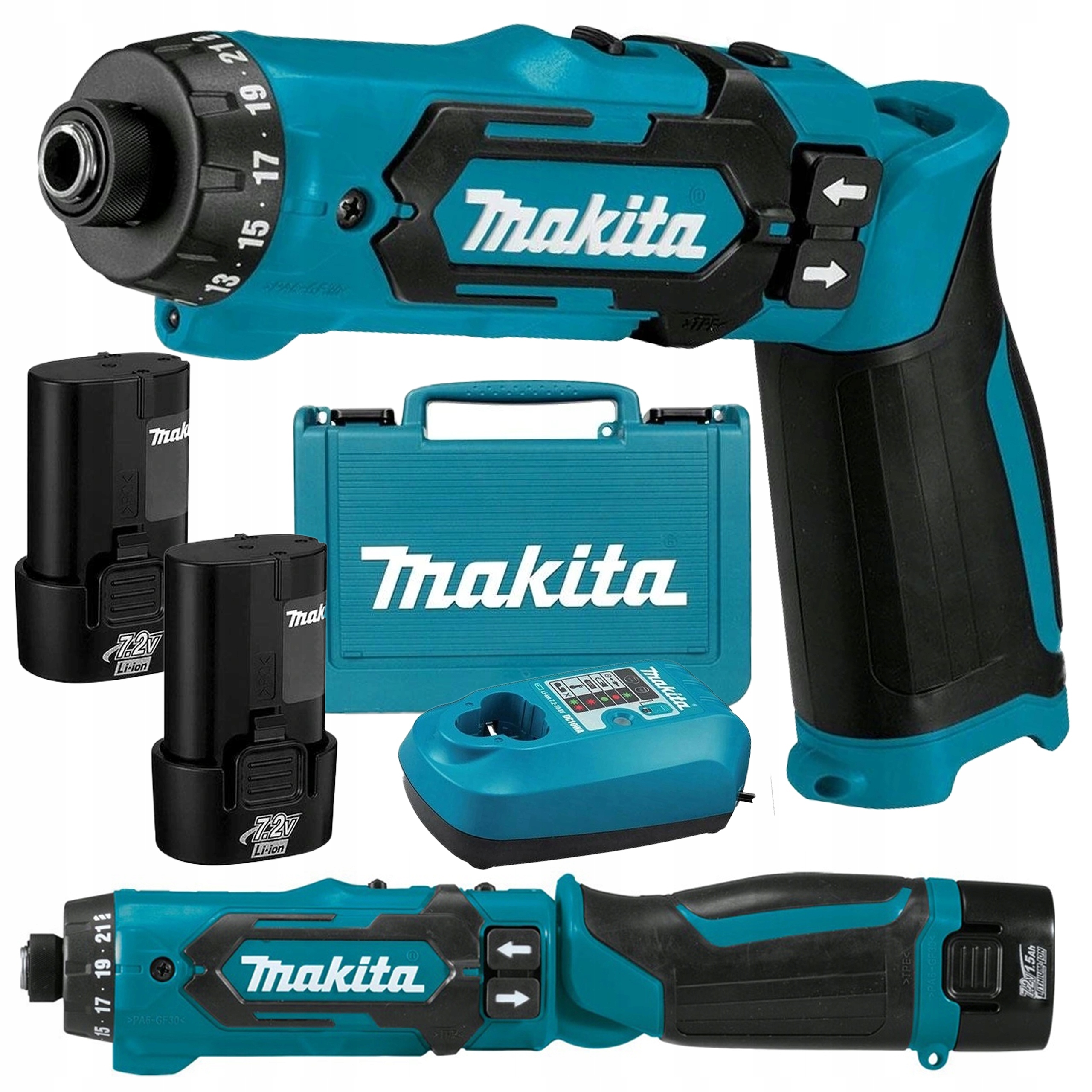 Поставляется в кейсе с двумя аккумуляторами BL0715 (7,0 В / 1,5 Ач) и зарядным устройством