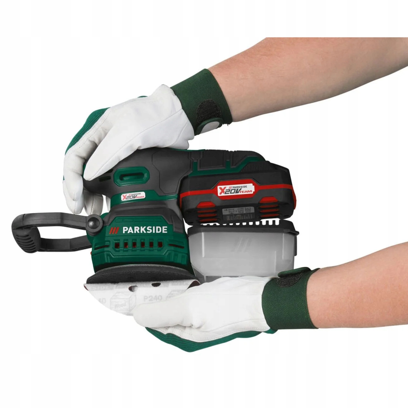Беспроводная эксцентриковая шлифовальная машинка PARKSIDE® x 20 В (без аккумулятора и зарядного устройства) с чехлом и аксессуарами в комплекте.