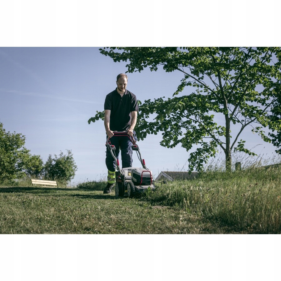 Функция автоматического наддува увеличивает обороты двигателя при движении по более высокой траве | Вы можете значительно продлить время работы, используя одновременно два аккумулятора | 3 варианта кошения: сбор, боковой выброс, мульчирование | Регулируемая ручка.
