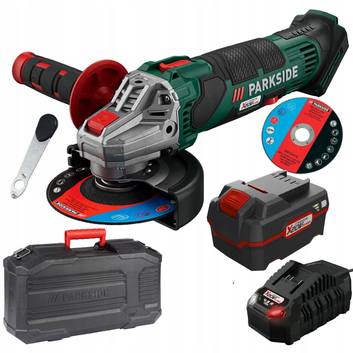 PARKSIDE® Аккумуляторная угловая шлифовальная машина 20 В с аккумулятором 4 Ач, зарядным устройством, чемоданом, ключом и диском в комплекте. Последняя модель.