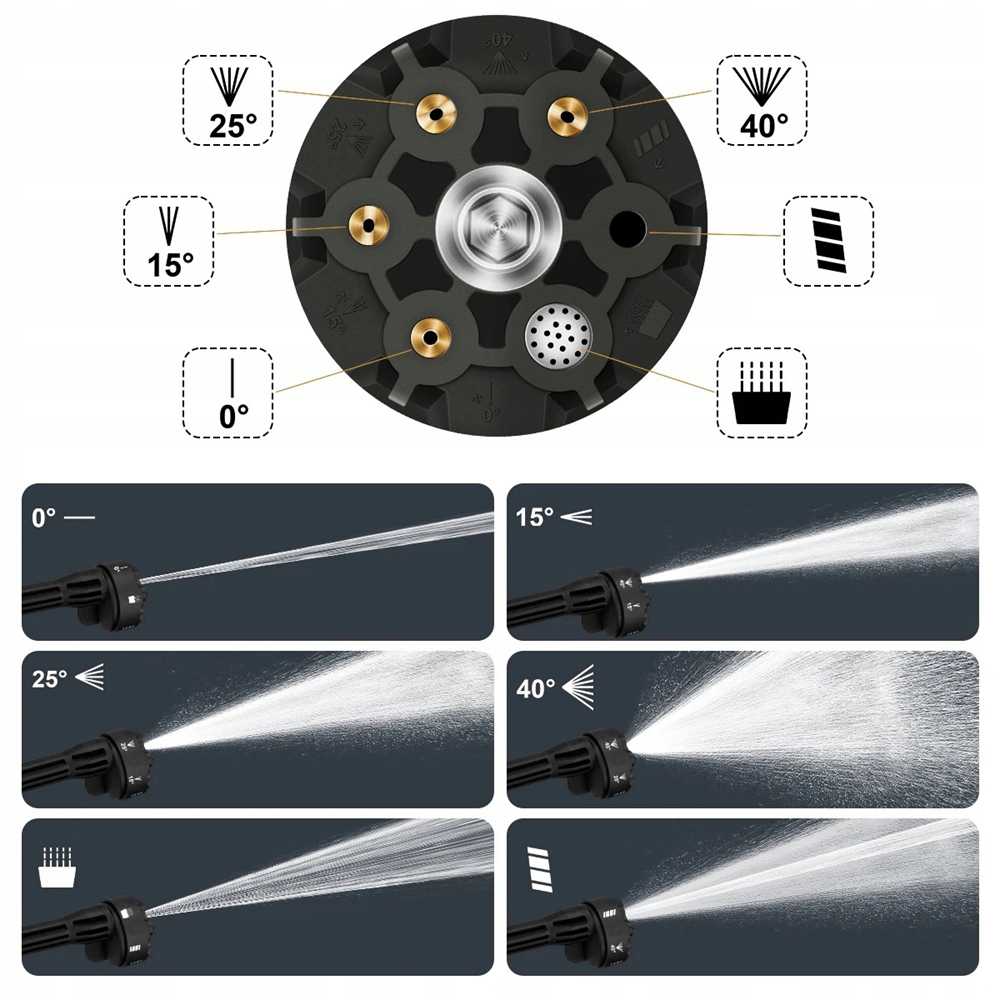- ✔️ Оснащен насадкой 6-в-1, с режимом 0°, режимом 15°, режимом 25°, режимом 40°, режимом распыления и режимом пены.