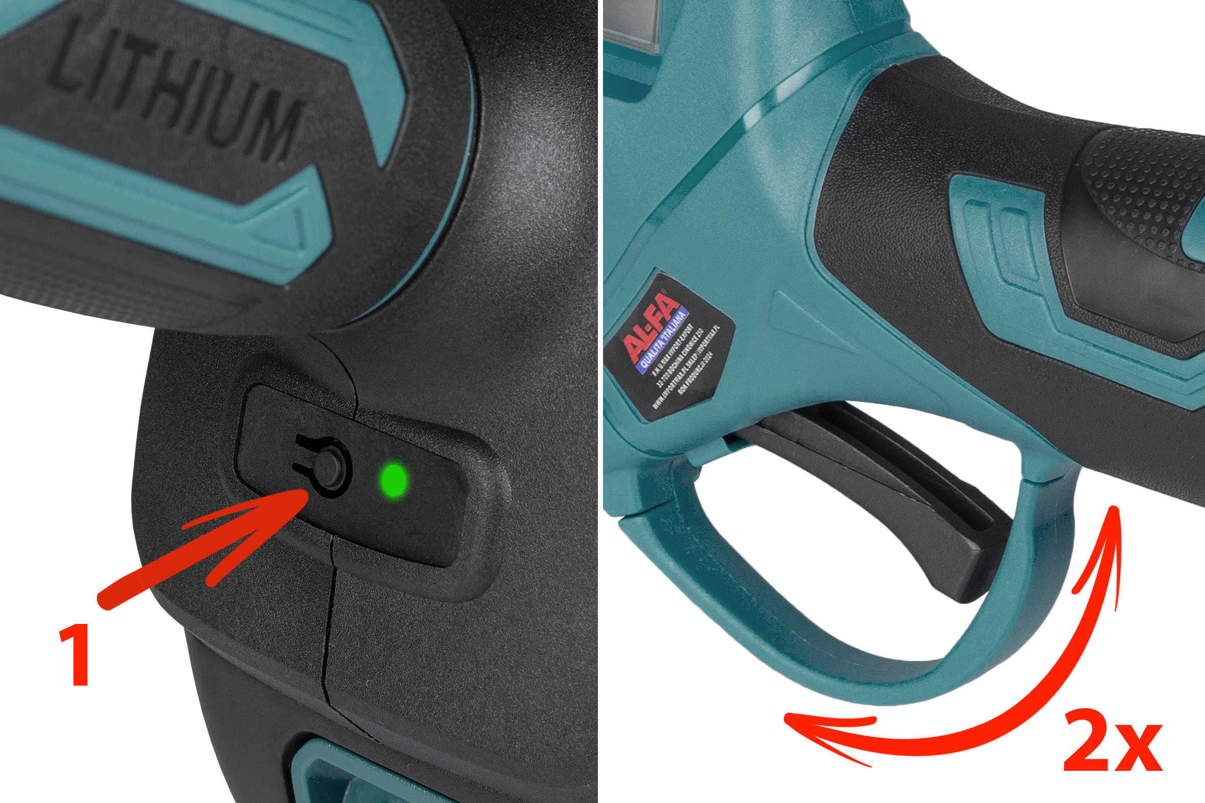 <ул>✔️ Двойная защита от случайного запуска: Чтобы запустить секатор, сначала включите главную кнопку, затем дважды нажмите на спусковой крючок. Только после звукового сигнала инструмент готов к использованию.