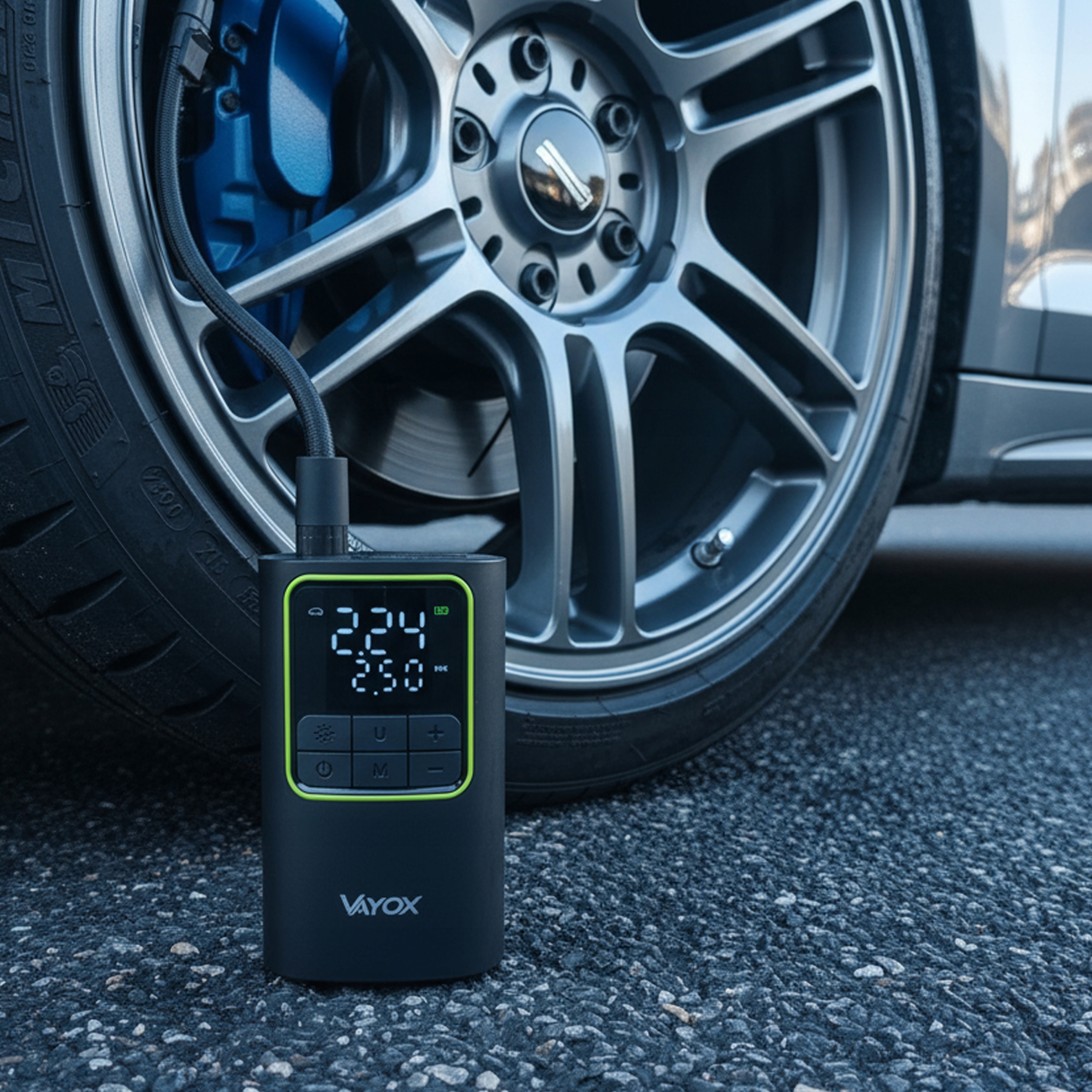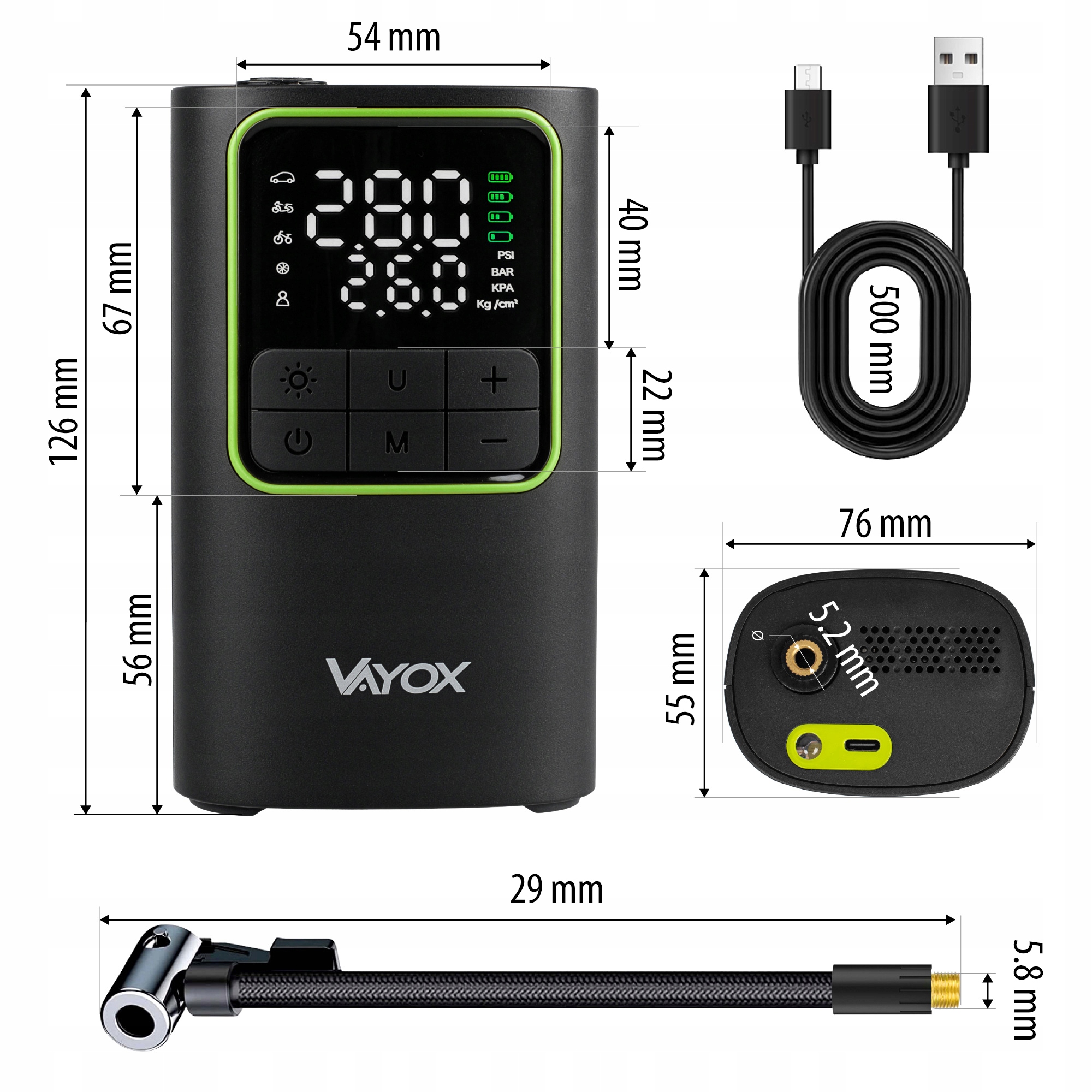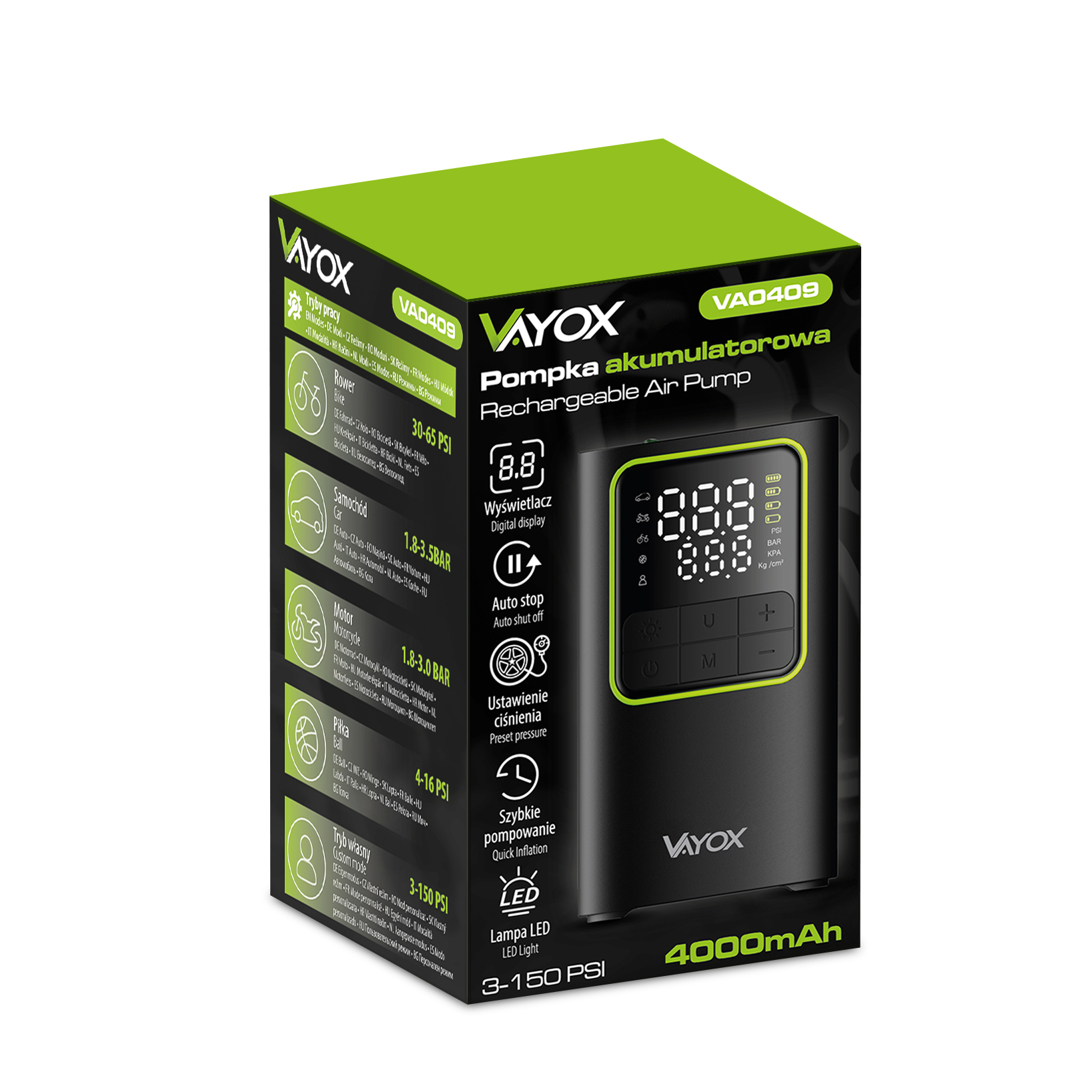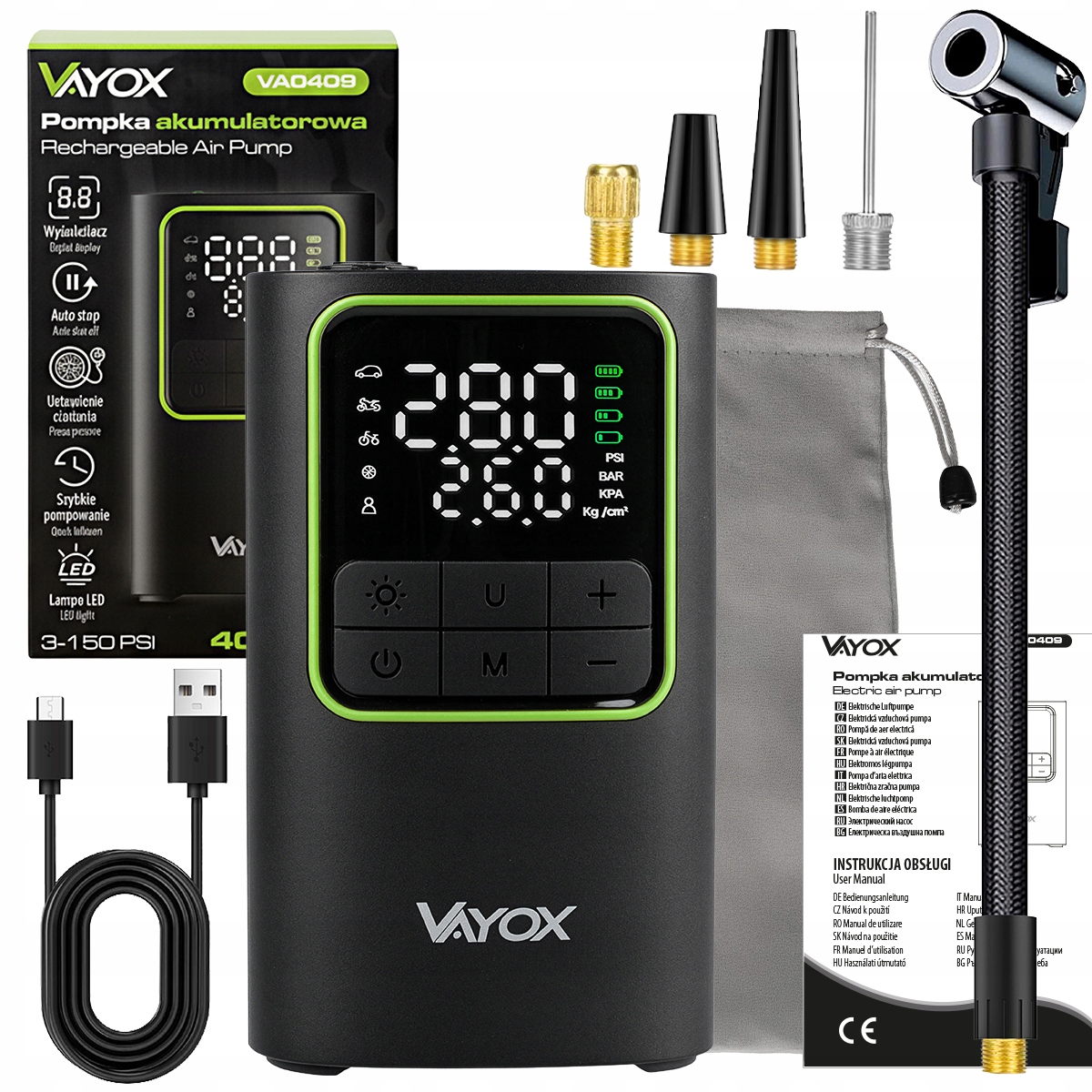 Современный аккумуляторный насос VAYOX — это сочетание мощности, мобильности и интеллектуальных решений, созданное для пользователей, ценящих комфорт и надежность. Благодаря эффективному двигателю и емкому аккумулятору 4000 мАч устройство легко накачивает шины автомобилей, мотоциклов, велосипедов и электросамокатов, а также мячи, матрасы, кольца для плавания и другие надувные аксессуары. При скорости воздушного потока 20 л/мин он накачивает колесо автомобиля размером 205/55/16 от 0 до 2,5 бар всего за 7 минут 35 секунд, что делает его одной из самых быстрых и эффективных моделей в своем классе.