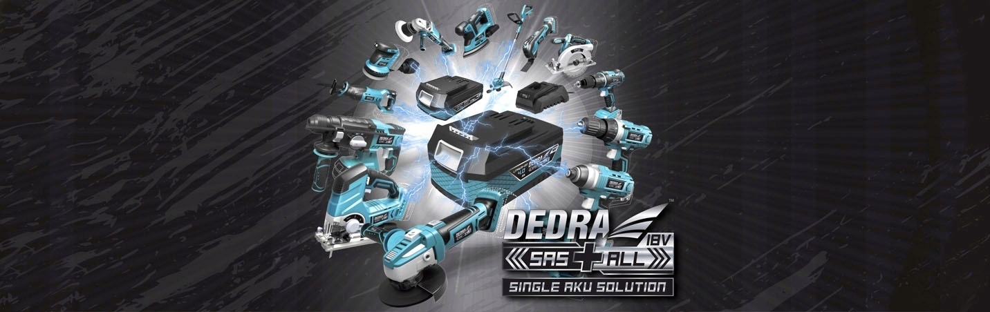 - Руторно-эксцентриковая полировальная машинка DEDRA DED7085 из серии SAS+ALL питается от одной батареи напряжением 18 В, от которой можно питать любое устройство из серии SAS+ALL.