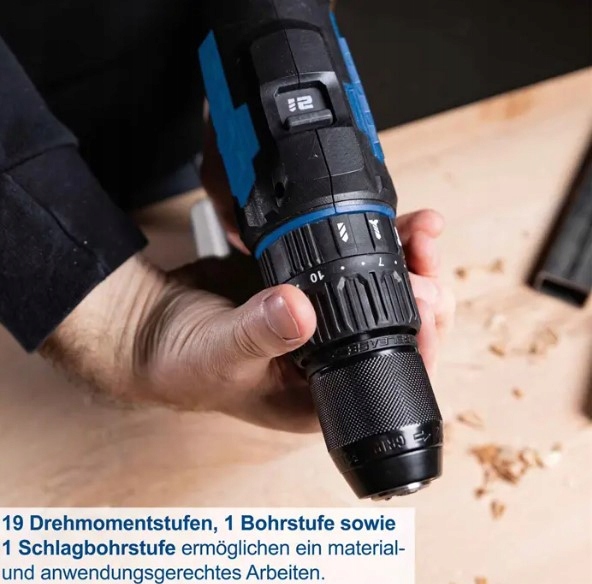 19 уровней крутящего момента, 1 уровень сверления и 1 уровень ударного сверления для работ, соответствующих материалу и применению