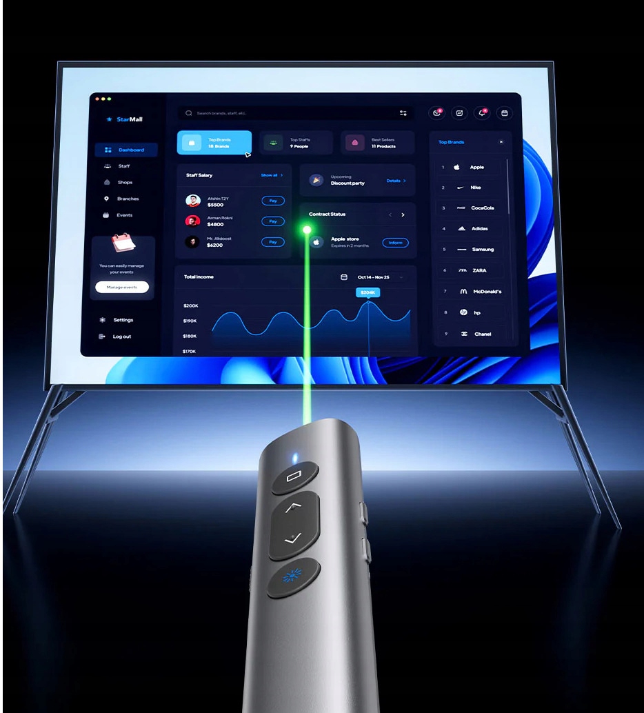Vention KQJH0 — стильный и современный презентационный стол, сочетающий в себе элегантный дизайн и интуитивно понятное управление. Благодаря мощному зеленому лазеру класса 3R он прекрасно выполняет свою задачу даже в хорошо освещенных помещениях и на большом экране. Дальность управления до 100 м и передача 2,4 ГГц означают, что вам не обязательно находиться за компьютером и вы можете свободно перемещаться по комнате. Управление связью одним касанием и быстрый режим черного экрана расширяют возможности управления, а питание через USB-C со светодиодным индикатором уровня заряда батареи обеспечивает удобство использования.