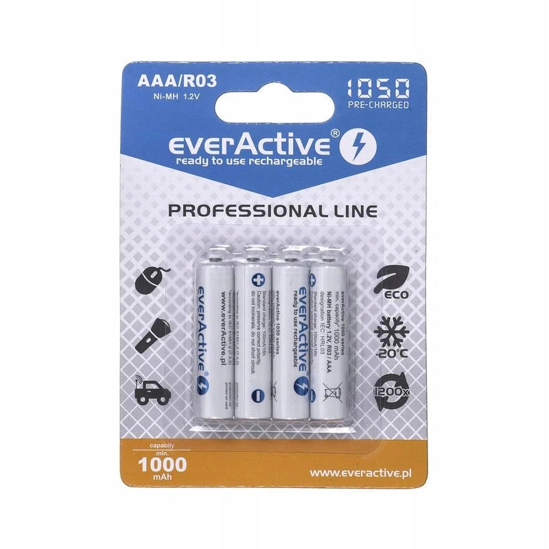 Серия Professional Line - также идеально подходит для профессионального использования.Инновационный аккумулятор R03 AAA 1050 мАч everActive, «мизинец». Изготовлено по «готовой к использованию» технологии.