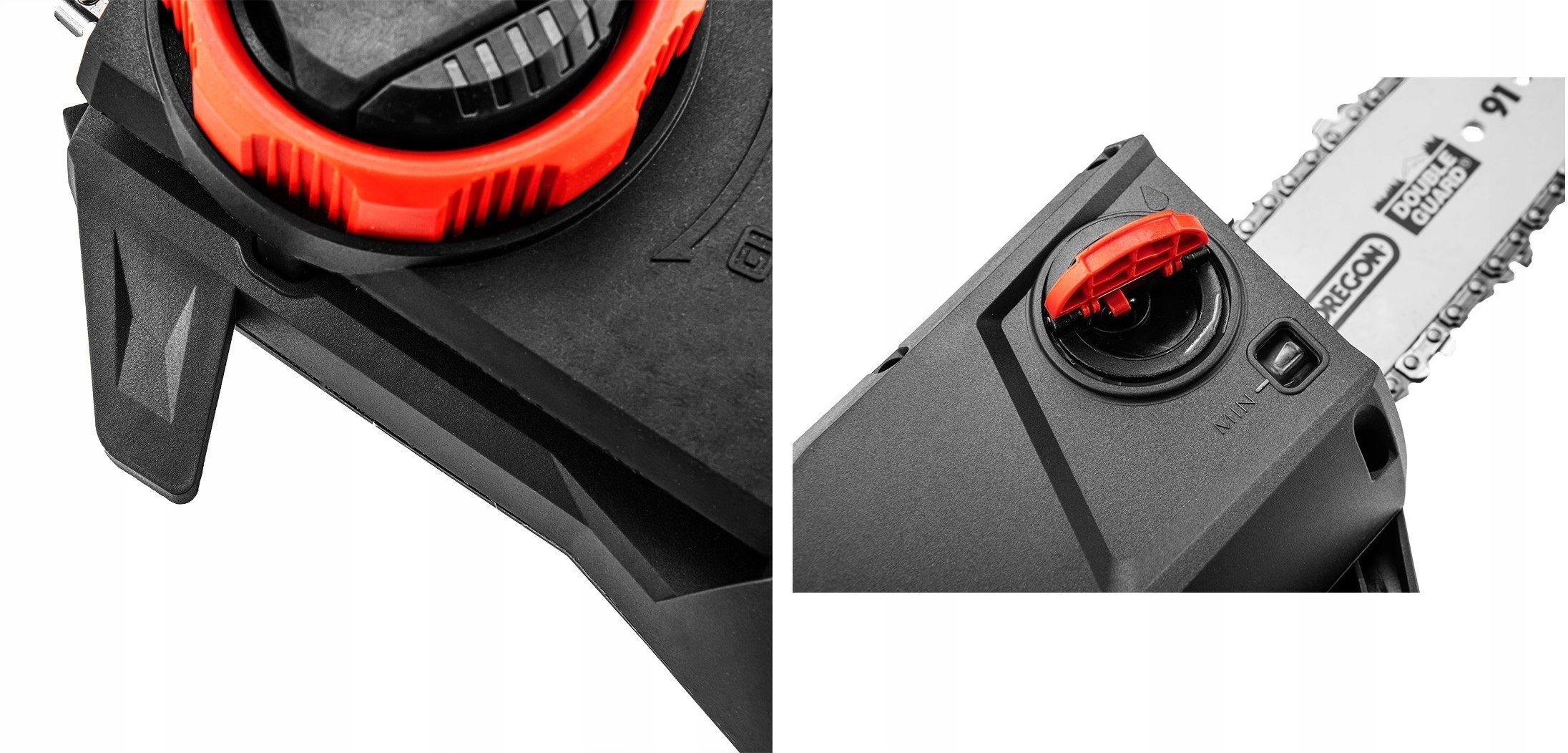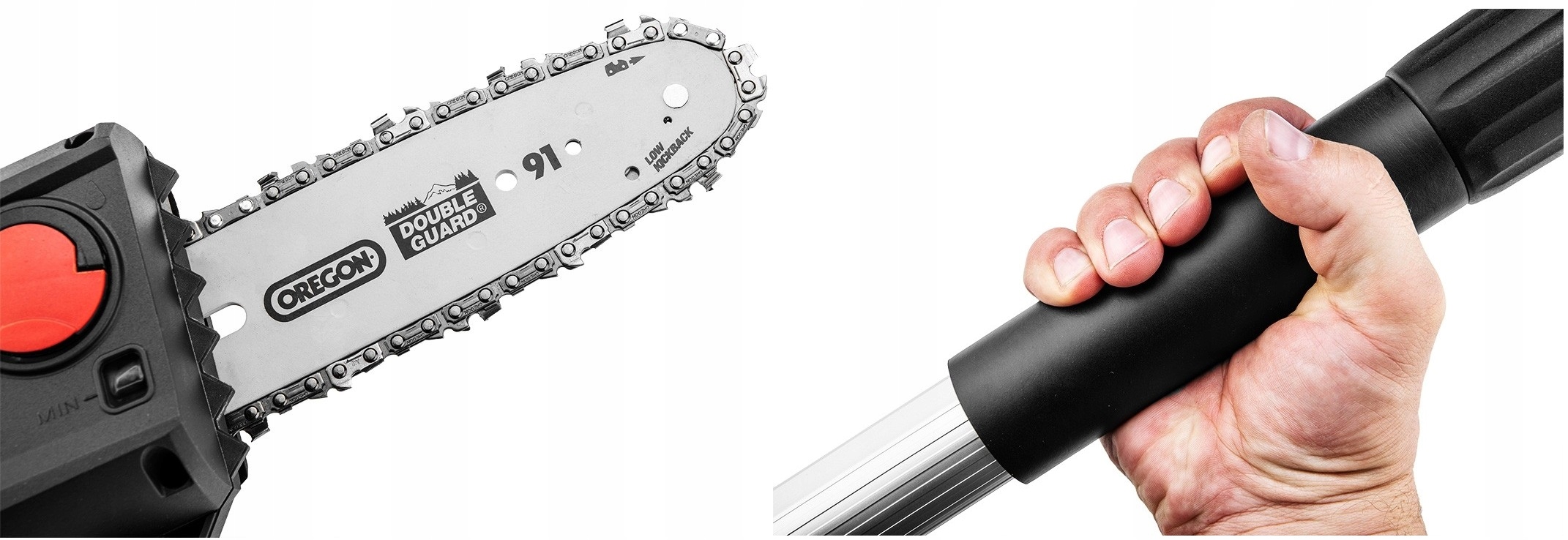 Инструмент с направляющей длиной 8 дюймов. Шина (200 мм) обеспечивает возможность натяжения цепи без инструментов и линейную скорость (без нагрузки) 8 м/с. Максимальный вылет бензопилы составляет 1,87 м.