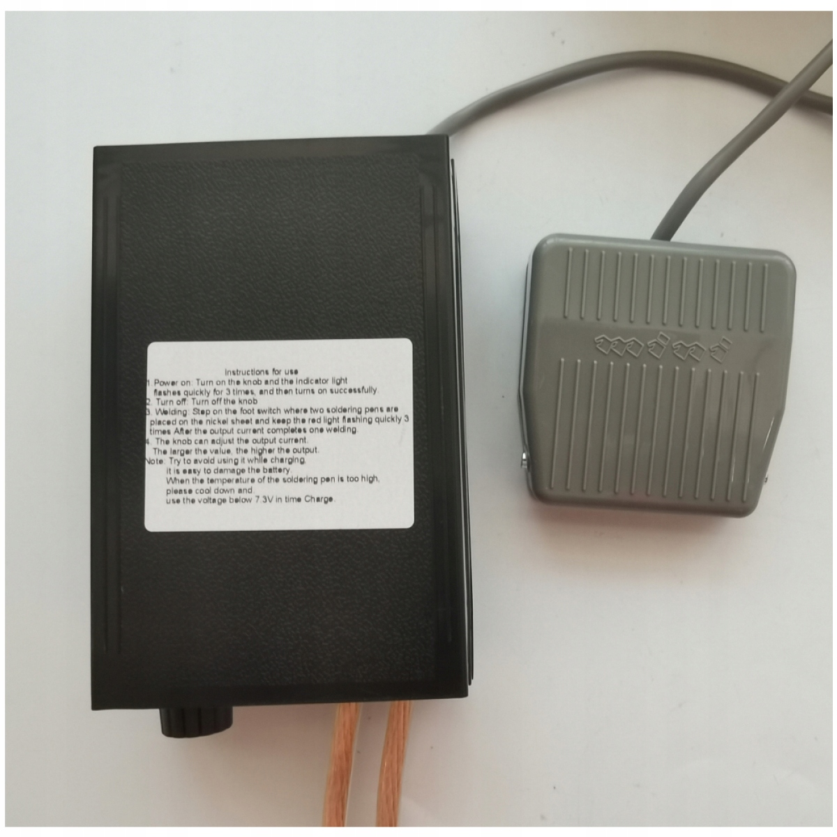 🔊- Световой индикатор: Поместите два паяльника на никелированную пластину, нажмите педальный переключатель. и продолжайте это делать. Когда красный индикатор быстро мигнет три раза, это означает, что выходной ток закончился и сварка завершена.