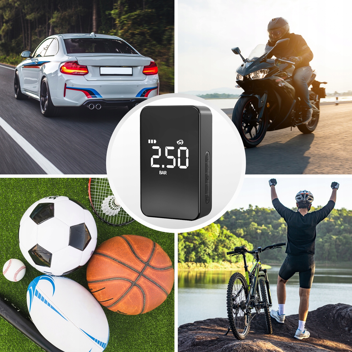 - С помощью этого устройства вы сможете накачивать шины не только в своем автомобиле, но и в мотоцикл, велосипед или детская коляска.