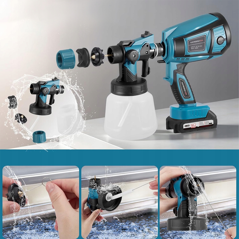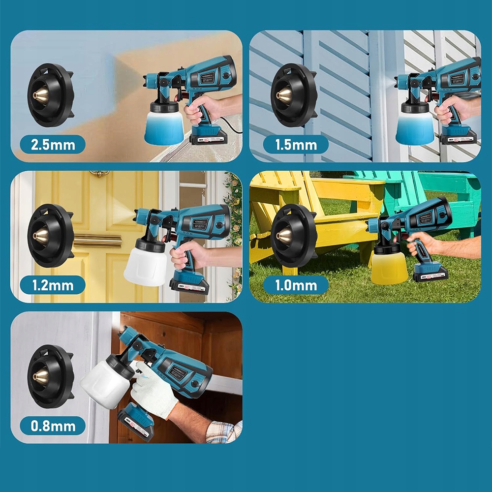 - Этот беспроводной пистолет-распылитель поставляется в комплекте с 5 соплами (0,8 мм, 1,0 мм, 1,2 мм, 1,5 мм и 2,5 мм).
