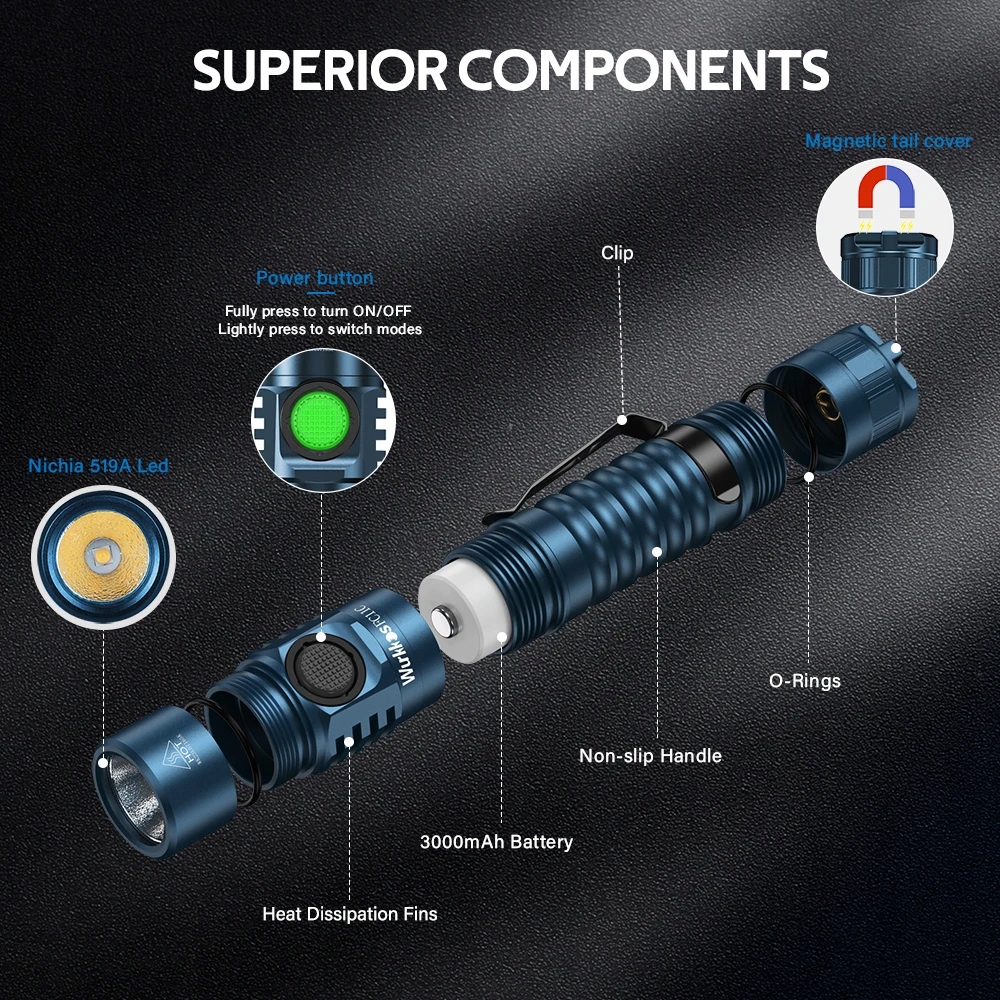 - 【Охлаждение мини-фонарика и низкое энергопотребление] Фонарик Wurkkos FC11-C EDC не только оснащен технологией контроля температуры ATR, но также использует микросхему понижающего драйвера постоянного тока. Только постоянный выходной ток может обеспечить стабильную яркость при включении светодиода. В режиме Super Bright фонарик автоматически регулирует яркость благодаря внутренней термозащите до тех пор, пока температура не останется на уровне 55°.