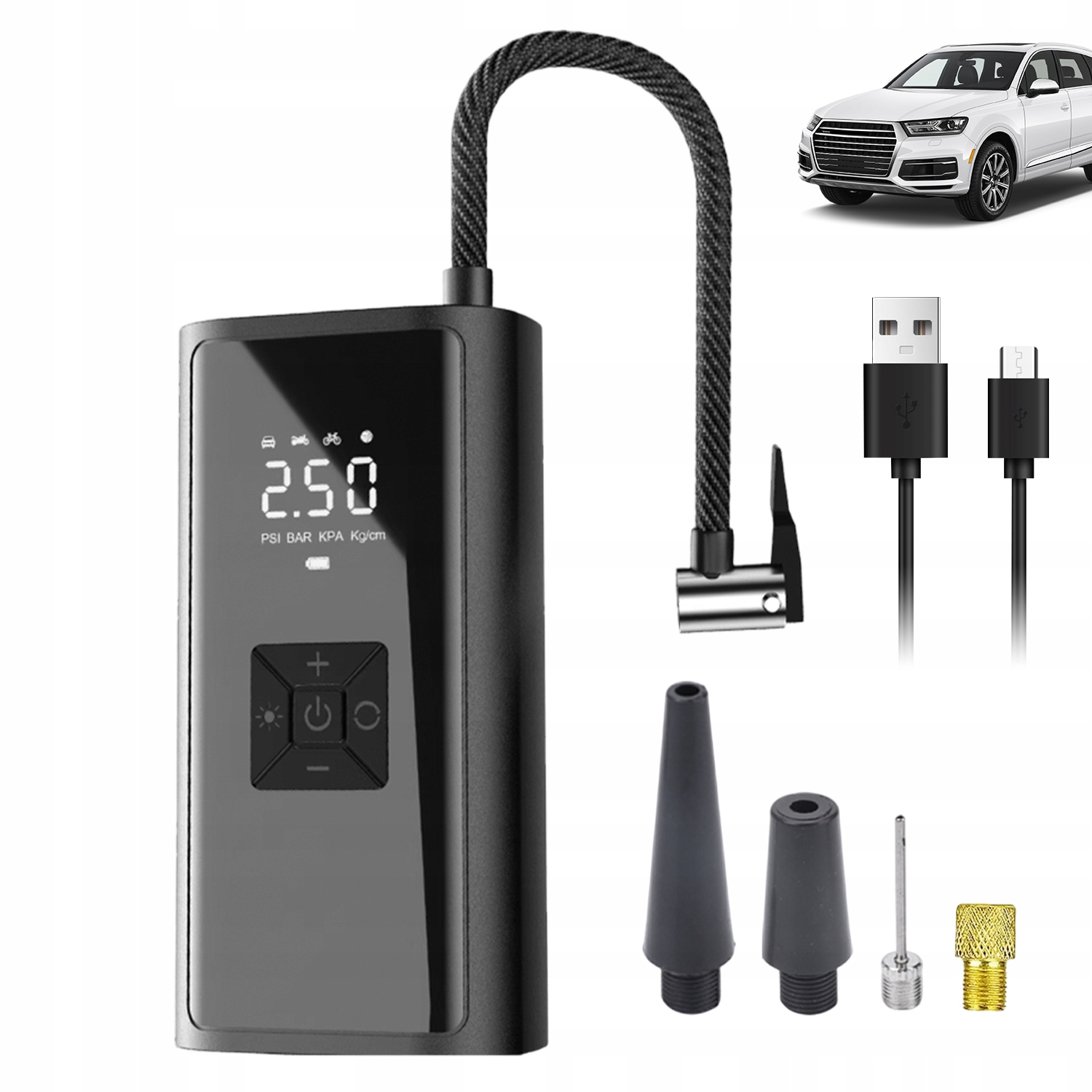 - Этот электрический воздушный насос поддерживает 3 типа натяжных устройств (бар, бар, кПа) и четыре режима работы, поддерживая накачивание мячей, велосипедных шин, мотоциклетных шин и автомобильных шин.