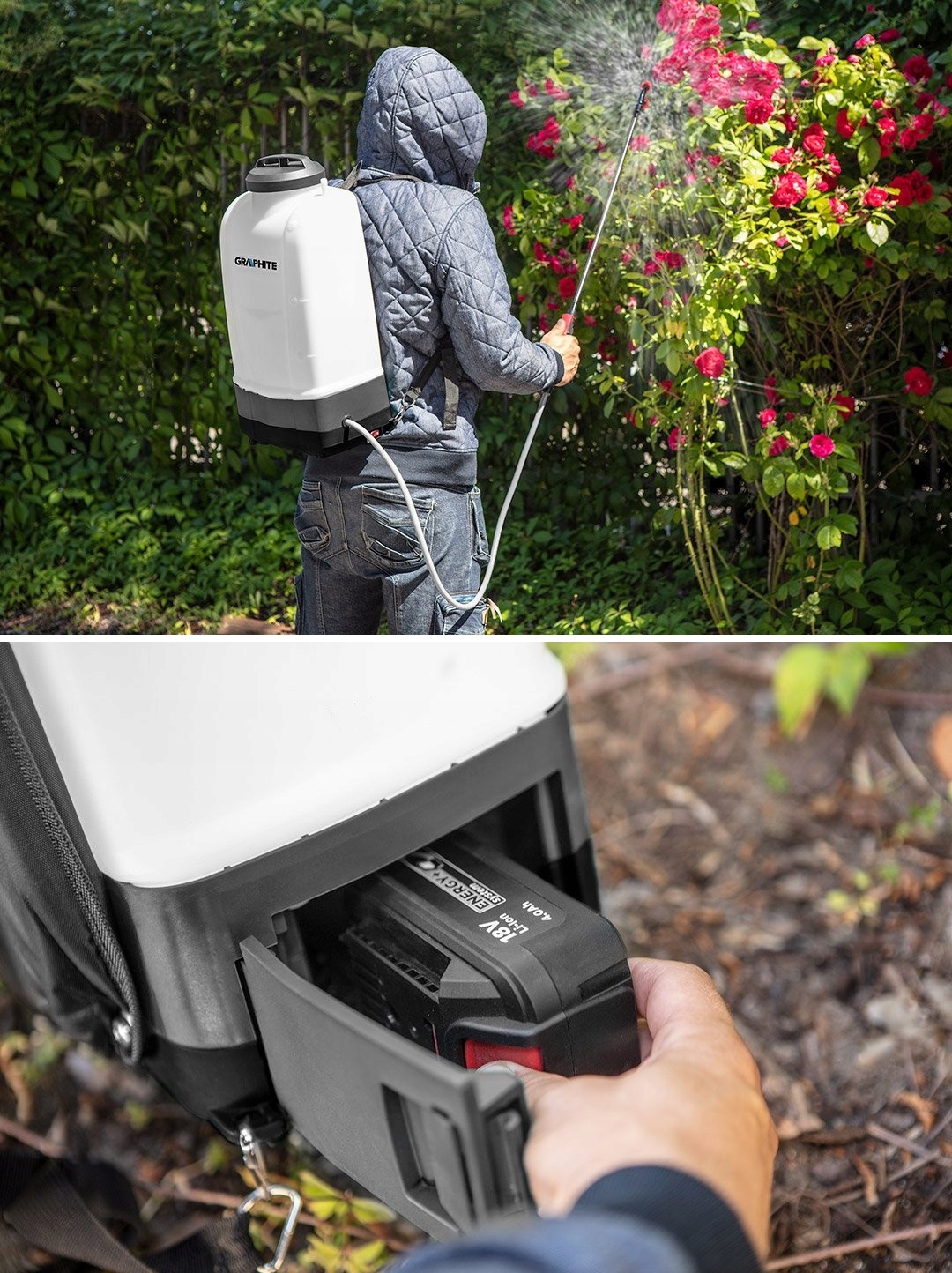 - Аккумуляторный опрыскиватель Energy+ 18 В 58GE106 от GRAPHITE – практичное устройство для использования дома и в саду.