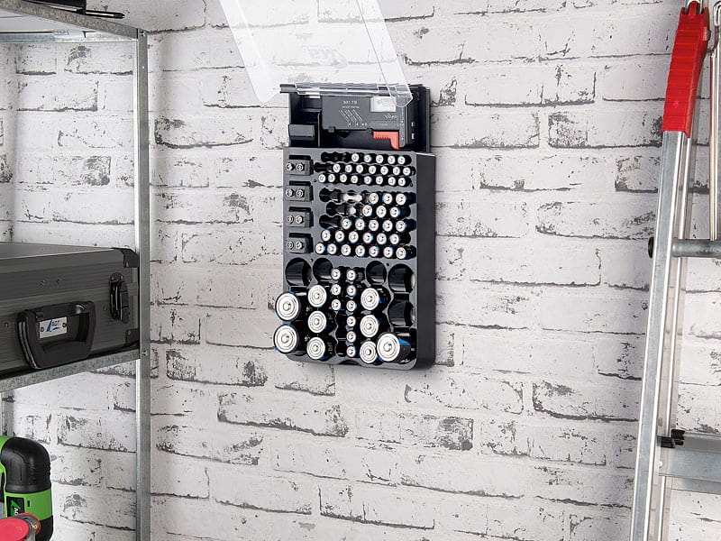 Вы можете хранить аккумуляторный ящик в ящике или на полке, либо закрепить его на стене – например, в мастерской или гараже. Благодаря прозрачной крышке вы можете сразу увидеть, сколько батареек данного типа у вас имеется на складе, а крышка защищает батарейки от пыли и грязи!