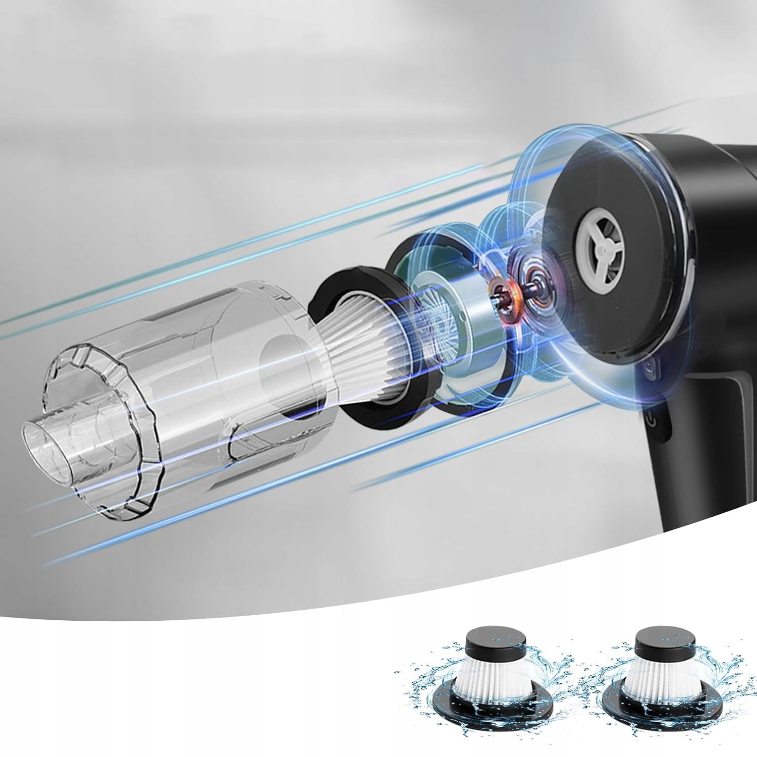 Этот автомобильный пылесос оснащен прозрачным пылесборником большой емкости. HEPA-фильтр и пылесборник можно снимать, мыть, сушить и повторно использовать в воде. Полезные советы: регулярно очищайте HEAP-фильтр, чтобы поддерживать достаточную мощность всасывания.