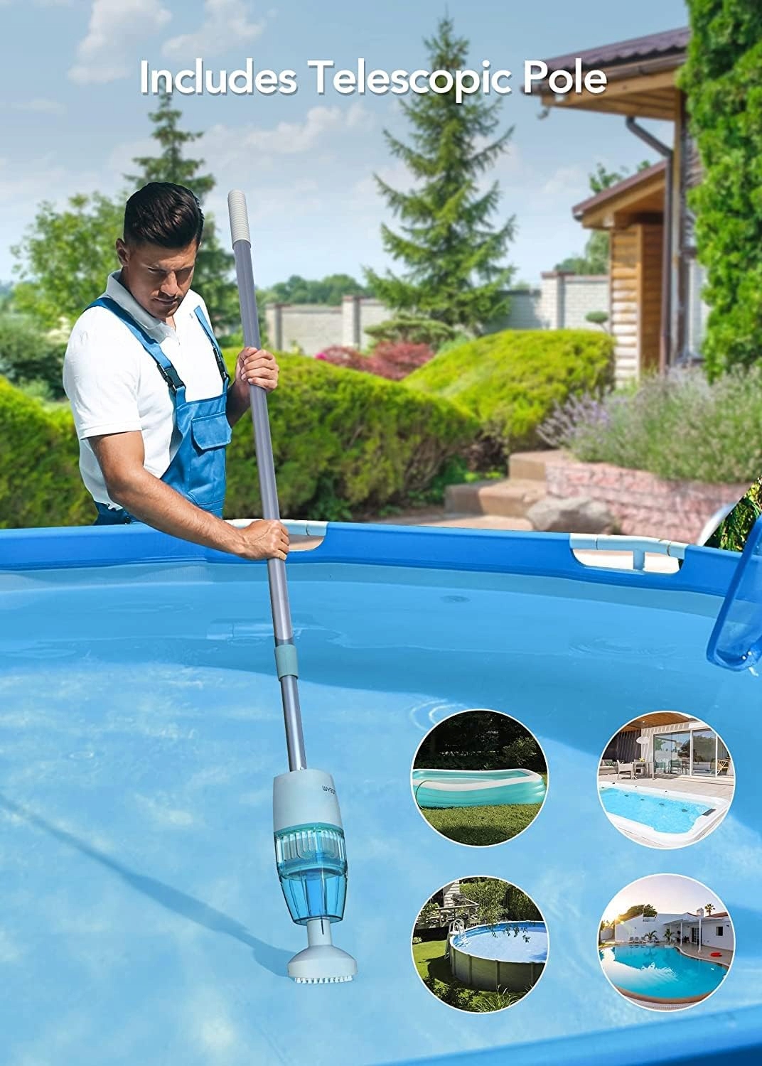 - Долговечность: беспроводной пылесос для бассейна оснащен литиевой батареей емкостью 5200 мАч и временем работы до 60 минут, поэтому вы можете использовать его без проводов, не прерывая уборку бассейна.