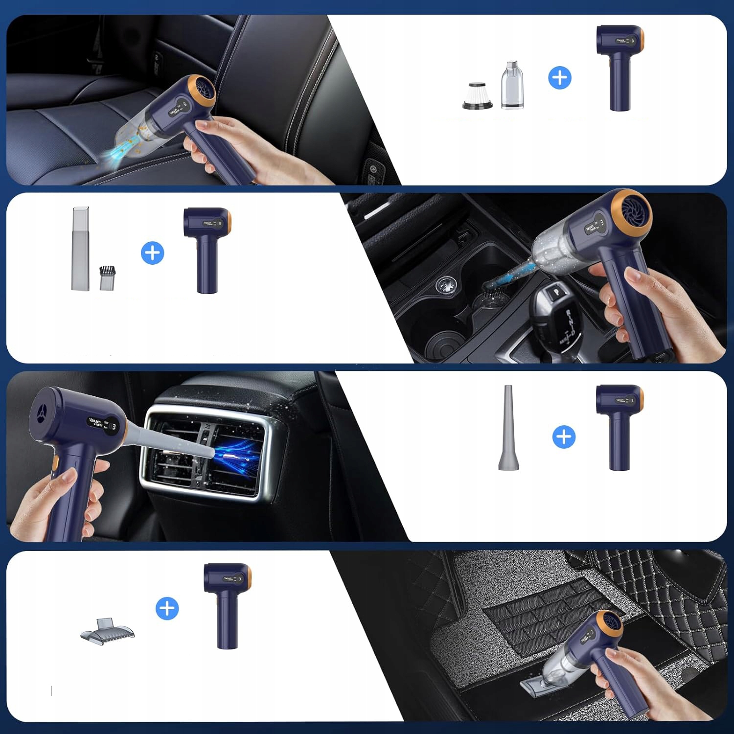 - ☑️В комплект автомобильного пылесоса входят 4 насадки разных типов, сдувка пыли, уборка пылесосом, откачка и уборка пылесосом, 4 в 1. Легко решает любые жизненные проблемы.