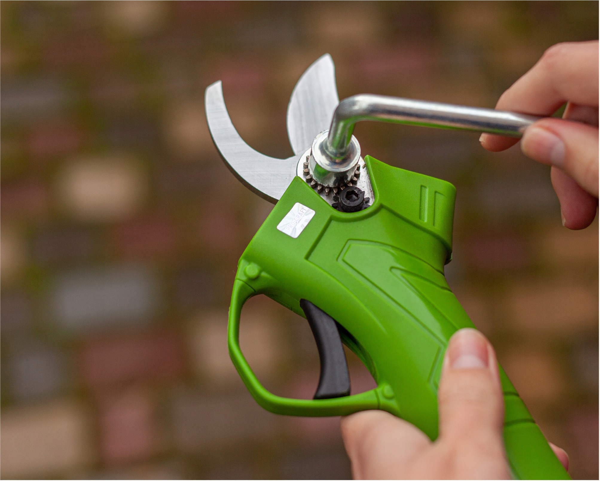 Секатор оснащен системой безопасности, предотвращающей случайное использование или травму. Запустите секатор с помощью кнопки на корпусе. Затем дважды нажмите рычаг переключателя, чтобы открыть лезвия. Тогда можно приступать к работе.