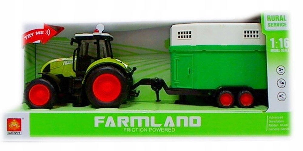 Трактор с прицепом для перевозки лошадей – прекрасный подарок для маленьких любителей сельскохозяйственной техники, благодаря ему каждый ребенок сможет почувствовать себя настоящим трактористом. Набор полностью выполнен из пластика и имеет ручной привод на задние колеса. Он имеет световые и звуковые эффекты, а также открывающуюся дверь трейлера. Нажмите любую кнопку на тракторе, и вы услышите характерные для настоящего трактора звуки (гудок, звук заднего хода и звук запуска двигателя).