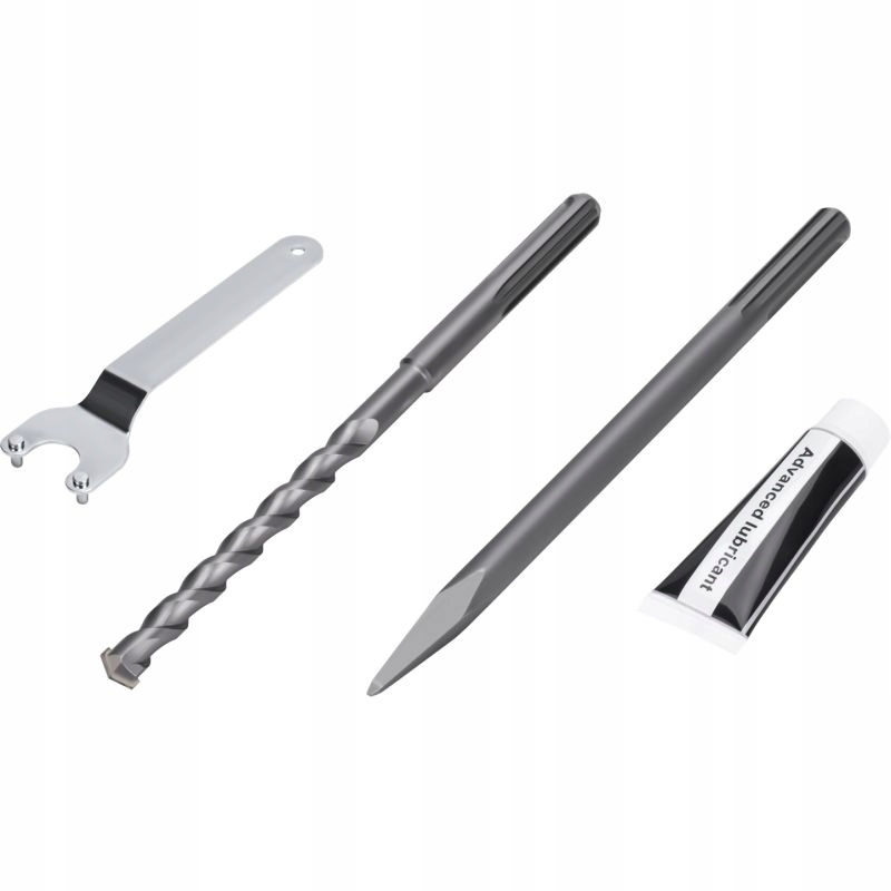 В комплект входят два аккумулятора емкостью 4 Ач, быстрое зарядное устройство, дрель, стамеска и инструкция по эксплуатации на польском языке.