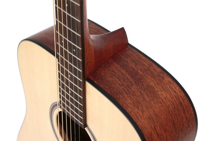 Отличный инструмент для акустических гитаристов среднего уровня. Верхняя дека гитары изготовлена из массива ситхинской ели, дека и боковины – из красного дерева. Гриф из красного дерева регулируется винтом. Накладка на гриф из палисандра. Отличные масляные клавиши, высококачественное седло и вставка бриджа. Инструмент тщательно изготовлен и звучит великолепно.