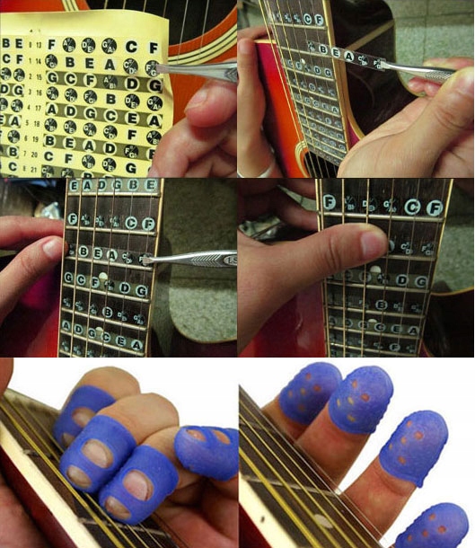 В нашем гига-наборе есть специальные наклейки, которые позволяют легко отмечать каждую ноту на грифе. Все, что вам нужно сделать, это оформить их в технике, показанной на фотографиях. О том, как распределяются отдельные звуки, вы узнаете в книге «Азбука гитары».