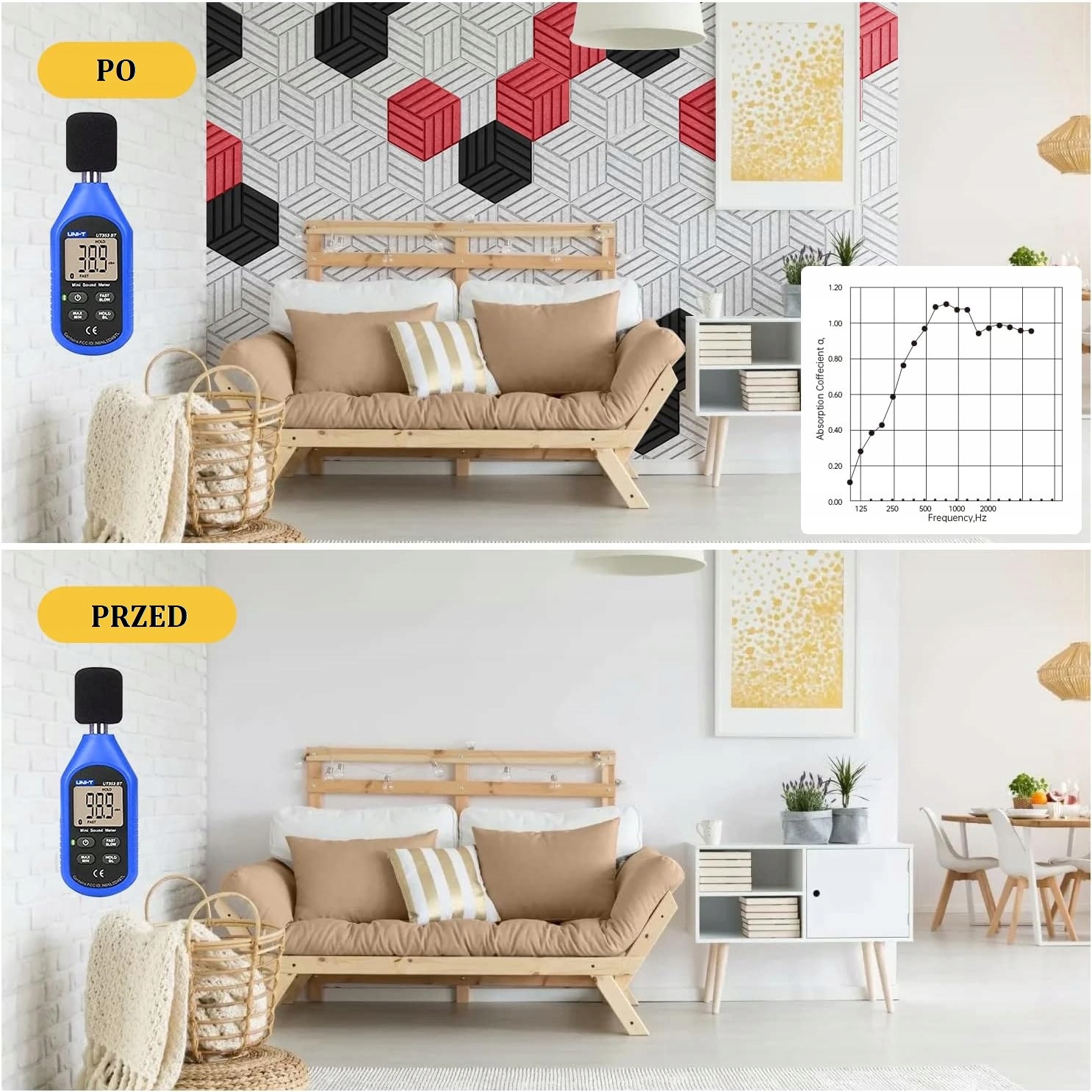 Испытания шумомера показали значительное снижение звука в помещении с акустическими панелями! Снижение шума более чем в 2 раза!