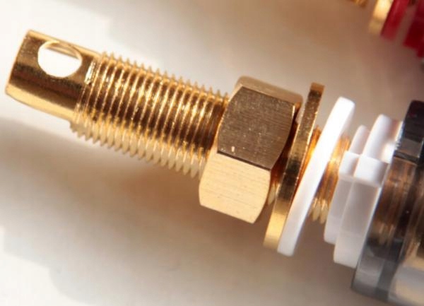 Эти высококачественные акустические терминалы предлагают аудиофильский звук и качество Hi-End по разумной цене. Полностью изолированные клеммы предотвращают случайное замыкание проводов динамиков. К разъемам динамиков подходят: штекеры типа «банан» (после снятия маленькой черной защитной крышки), лопатки или оголенные провода диаметром до 5 мм.