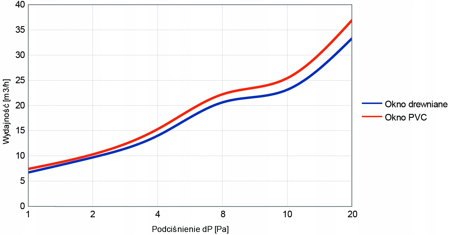 - При разнице давления снаружи и внутри здания dP= 20 Па эффективность 33 м³/ч;