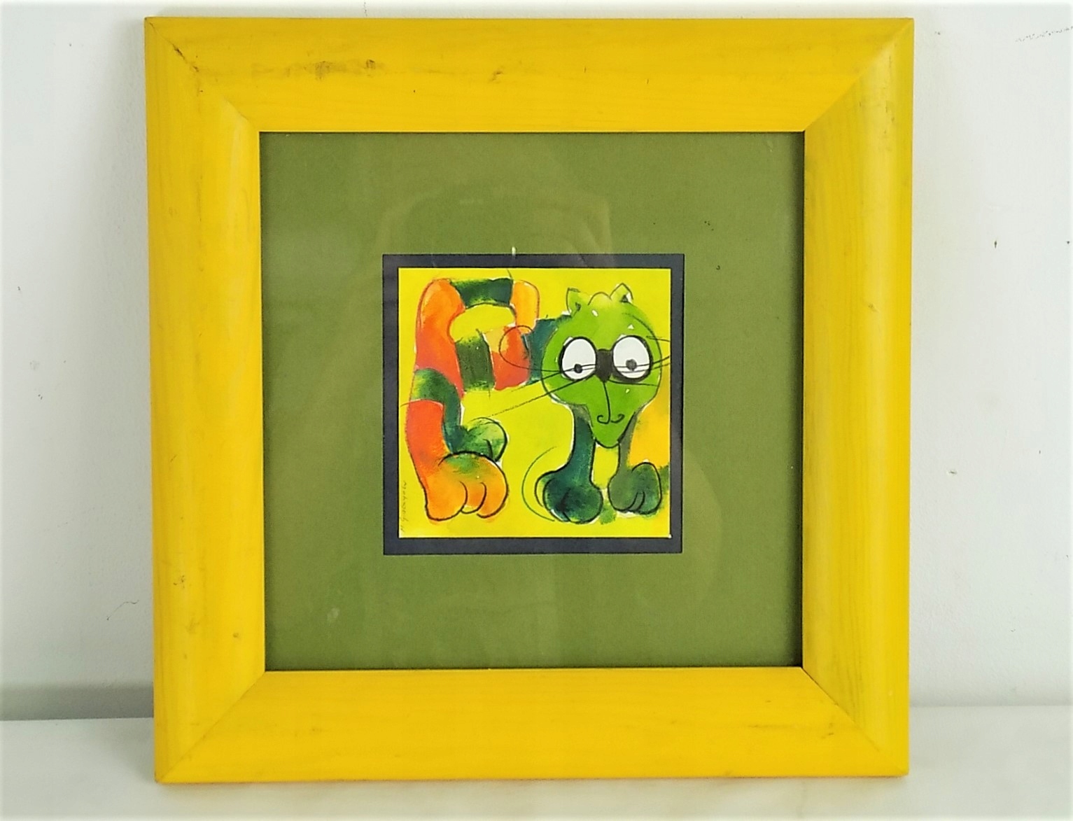 Картон, акварель, со стилизованным, немного сюрреалистическим изображением кота.