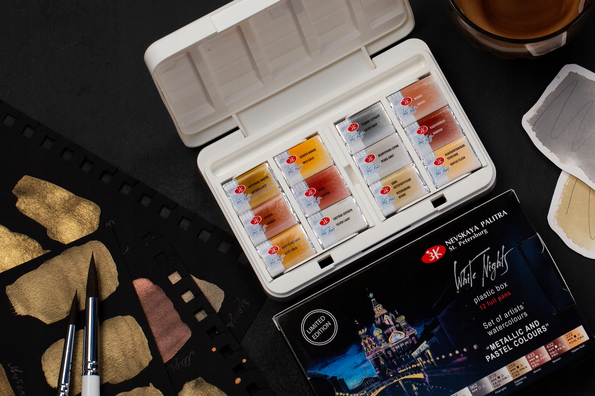 Набор металлических/пастельных акварельных красок в пластиковом футляре.