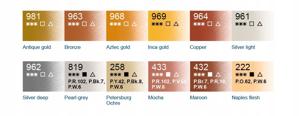 Они изготовлены из тонкоизмельченных пигментов и связующее с добавлением гуммиарабика - считается лучшим растительным клеем для изготовления художественных водных красок и меда. Высокая концентрация и фрагментация пигмента гарантируют высокую интенсивность цвета даже в разбавленном виде.