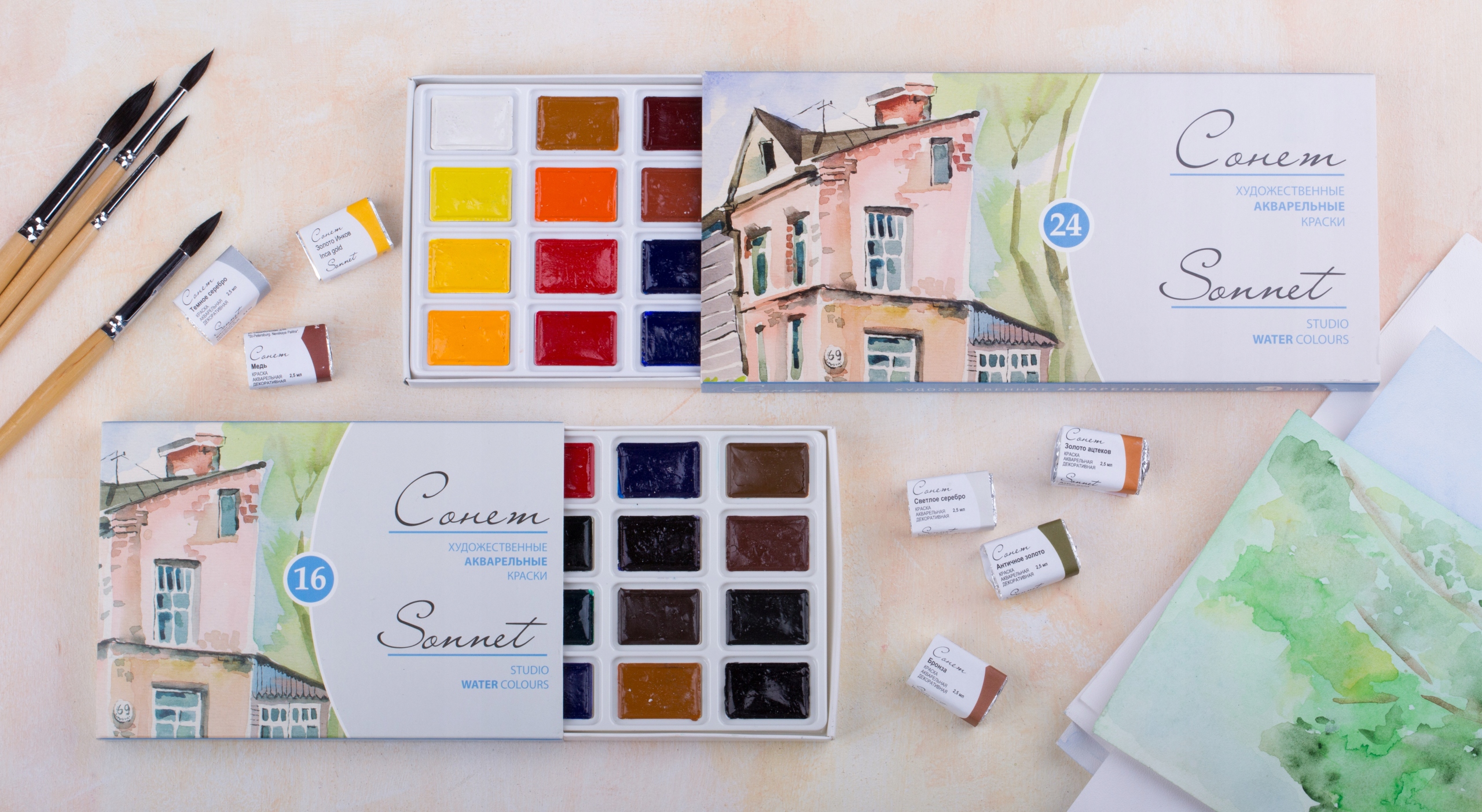 Акварельные краски серии Сонет изготовлены на основе высококачественных пигментов и связующих веществ, гарантирующих основные свойства акварельных красок:
