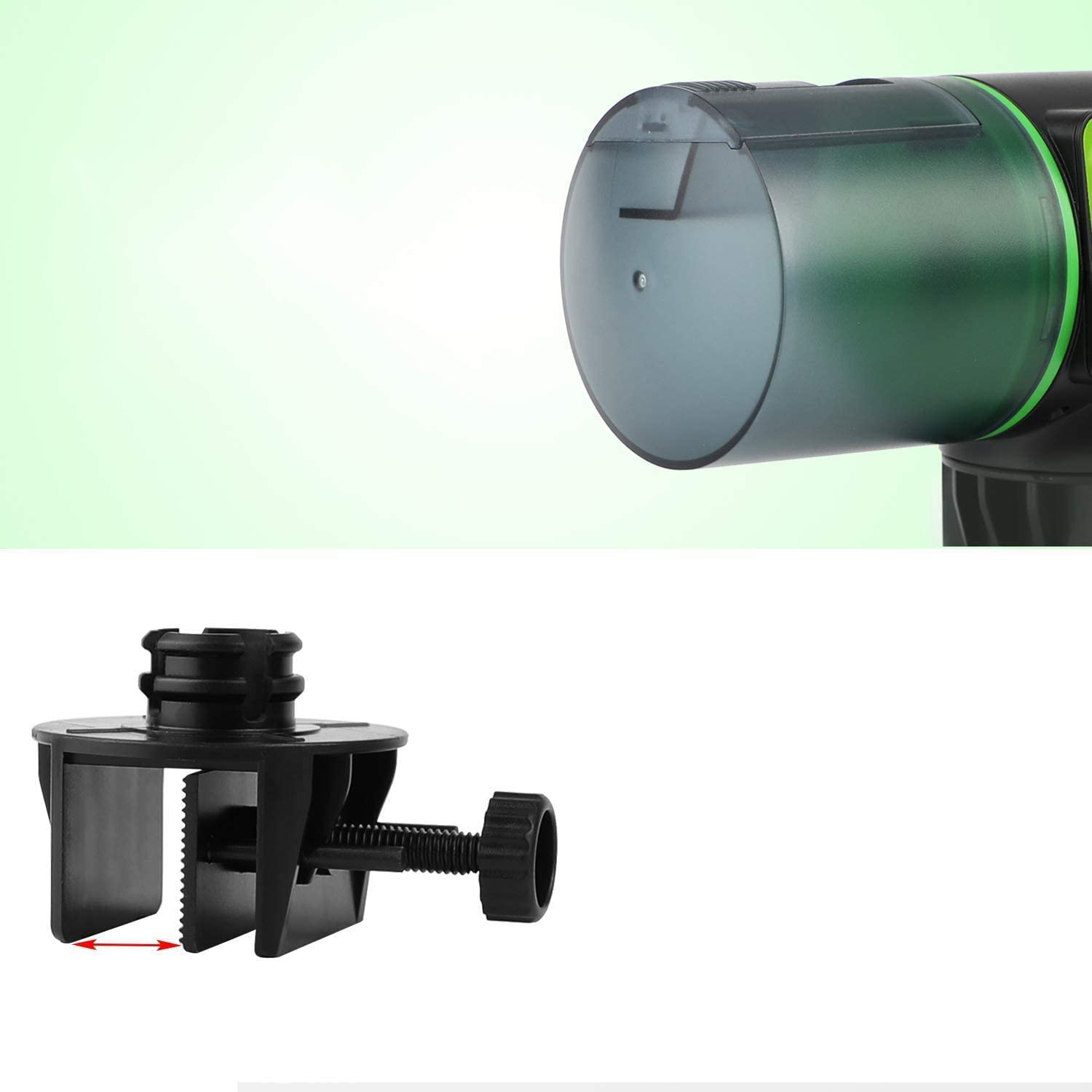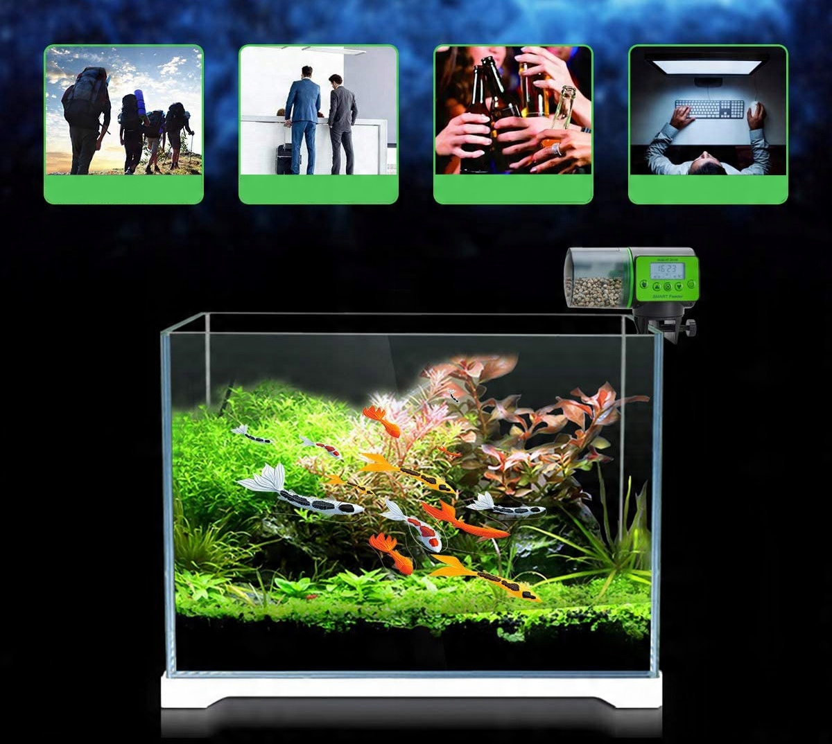 Кормление в верхней части кормушки для рыб, без удаления ведра пищи, может легко увеличить или уменьшить количество пищи. Поскольку основание цифрового кормушки для рыбы может быть повернута, после установки его можно превратить в удовлетворительное положение.