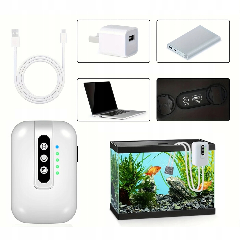 2 Вт, максимальный поток воздуха 3 л/мин x 2, емкость батареи 2000 мАч. Двойной воздушный выход, подходящий для 30-100 л аквариума.