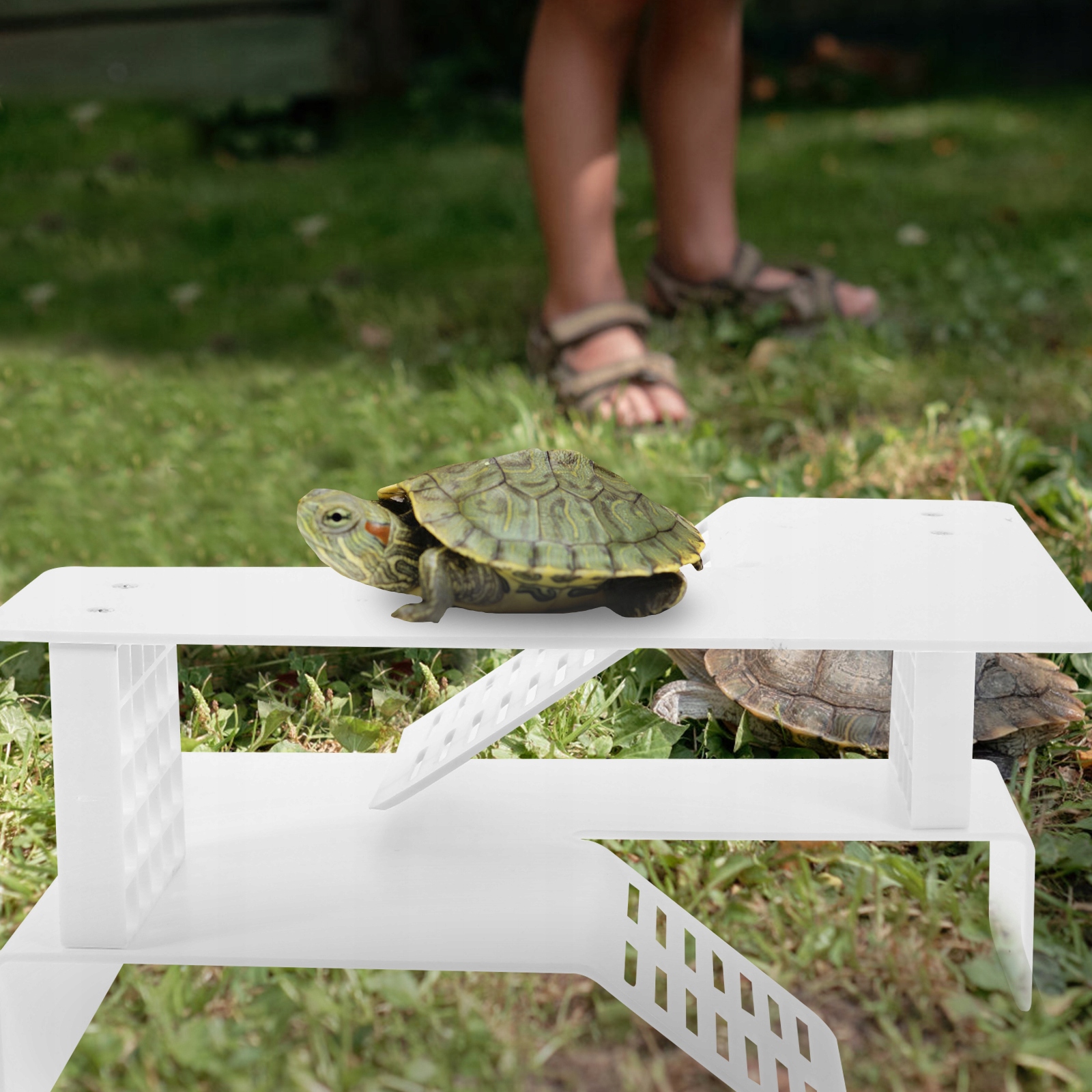 ✅ - Черепаха может подниматься на платформу, чтобы получать удовольствие от принятия солнечных ванн, еды, отдыха, игр