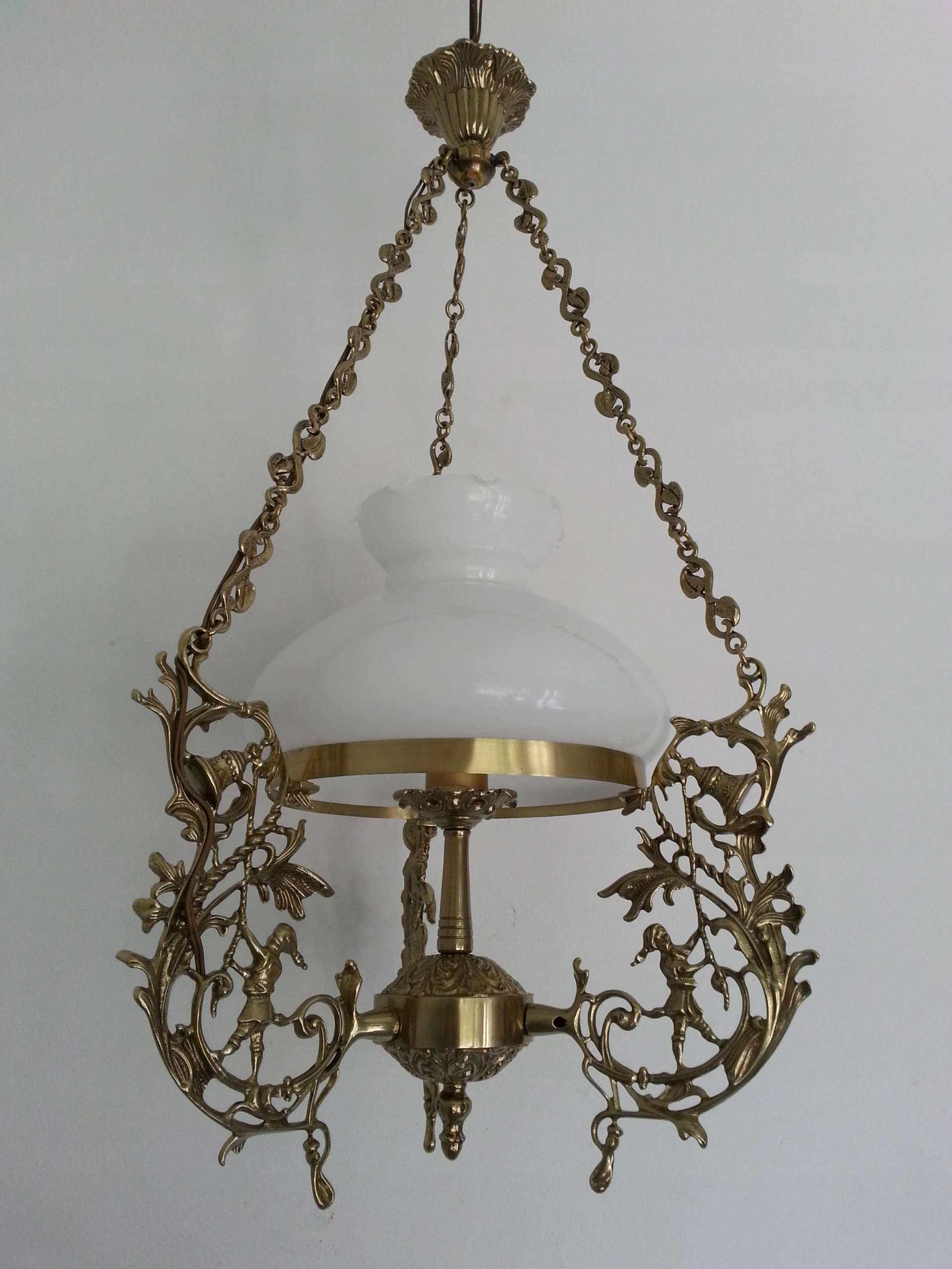 продает красивую латунную люстра Alladyn, украшенную стеклянным абажуром, идеально подходит для комнаты с высотой от 2,40 до 2,85 м. Высота люстры составляет около 77 см, диаметр абажура около 23 см, руки охватывают около 38 см, большая нить, способность луковицы макс 60 Вт.