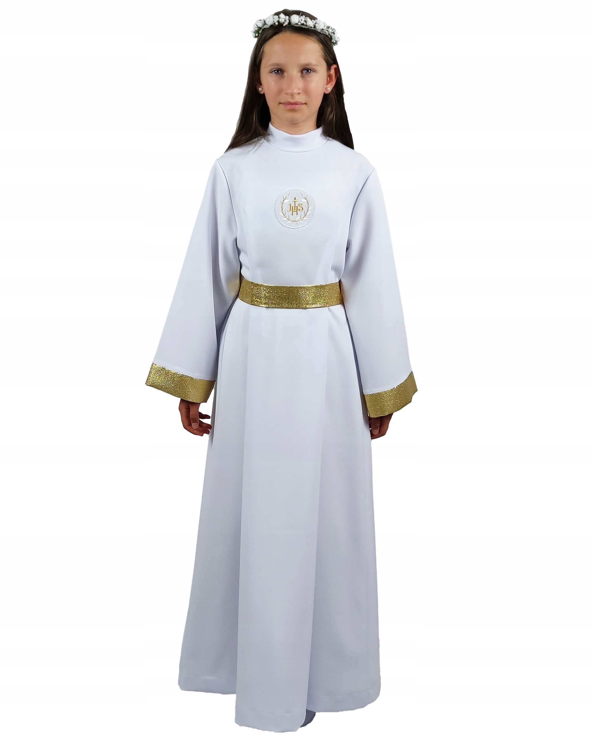 Безупречно-белый альб простого кроя – базовый наряд для Первого Причастия.