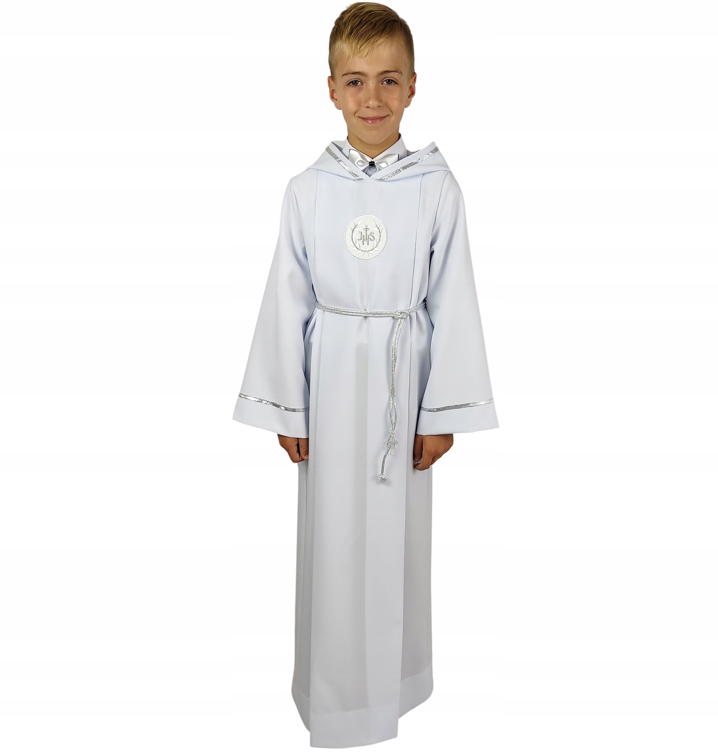 Безупречно-белый альб с капюшоном – типичный наряд мальчика для первого причастия.