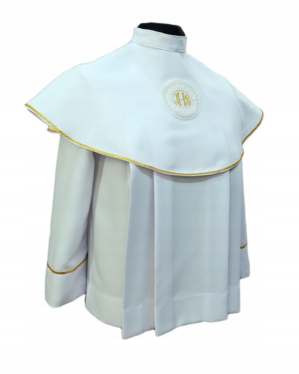 Чаша для причастия, двухчастная, с воротником. Воротник застегивается сзади, спереди пришивается ХОСТИЯ. Минимальное количество украшений, воротник и рукава отделаны золотой лентой. Стелька изготовлена из синтетической эластичной ткани. Стихий очень практичен в использовании, его легко стирать и гладить.