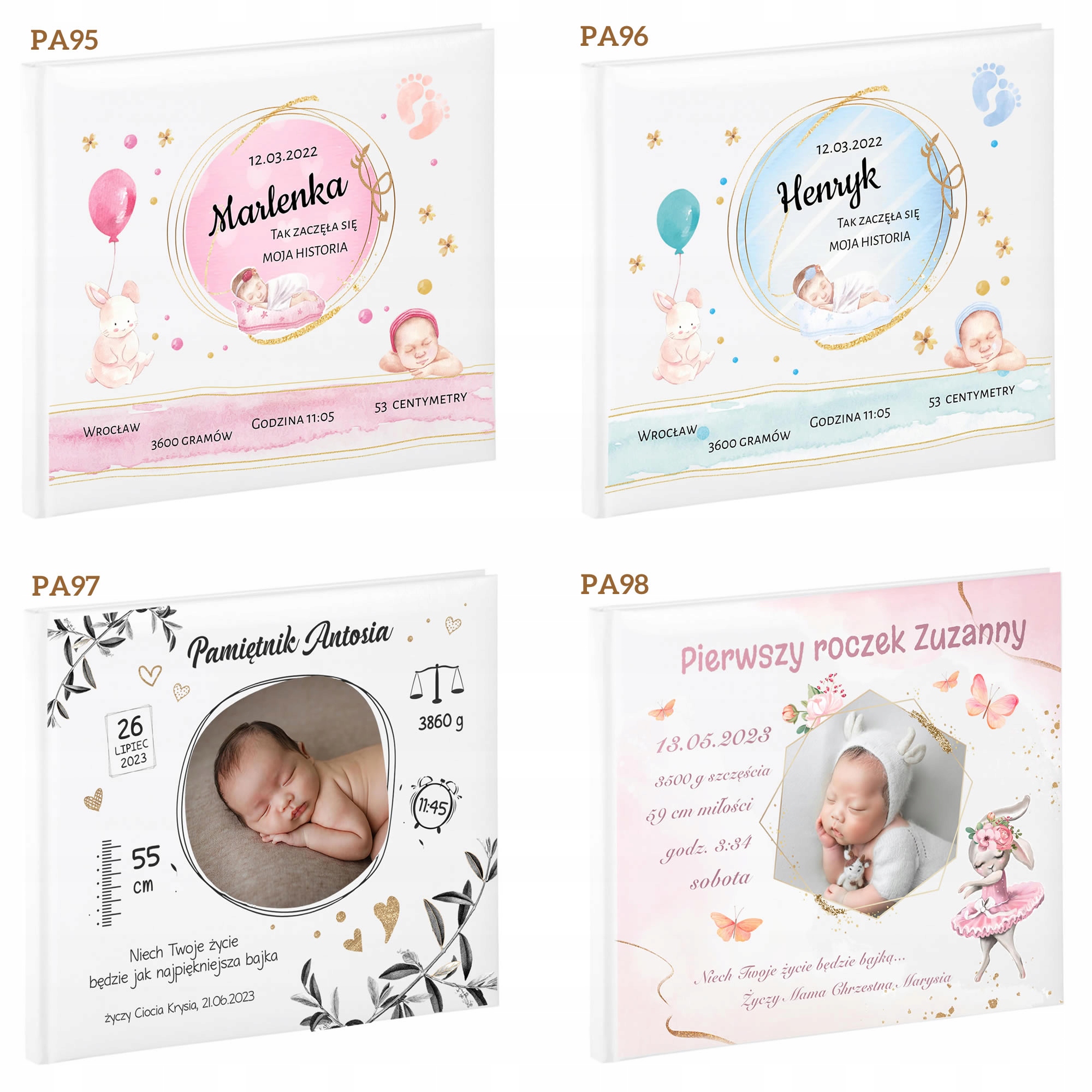 Жду тебя/Твоя семья/В день твоего рождения/Добро пожаловать в мир/В твой день рождения (что происходило в мире)/Это твой дом/ Твоя первая неделя/Первый раз.../Так прошел первый год (1,2,3,4,6,8,12 месяцев)/Отпечаток руки и первые волоски/Твои любимые лакомства/Твои первые слова/Первый день рождения/ Время самостоятельности/Первый праздник/Первое Рождество/Ваши любимые игрушки/Ваши друзья/Первый день в детском саду/Особенные моменты/Наши наблюдения/Ваши первые рисунки/Смешные ситуации/Сказки и стихи, написанные специально для вас.