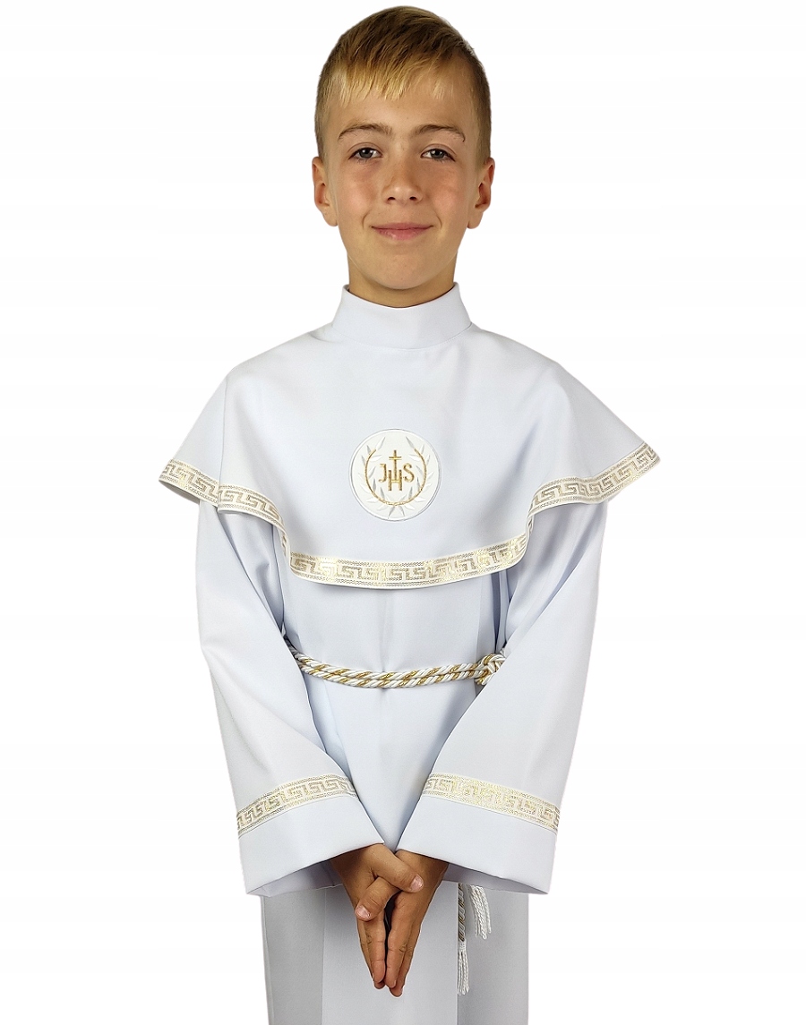 Безупречно-белый альб простого кроя – базовый наряд для первого причастия.