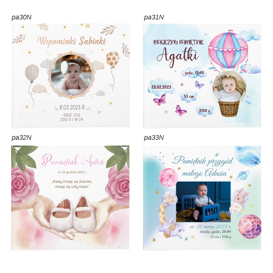 Жду тебя/Твоя семья/В день твоего рождения/Добро пожаловать в мир/В твой день рождения (что происходило в мире)/Это твой дом/ Твоя первая неделя/Первый раз.../Так прошел первый год (1,2,3,4,6,8,12 месяцев)/Отпечаток руки и первые волоски/Твои любимые лакомства/Твои первые слова/Первый день рождения/ Время самостоятельности/Первый праздник/Первое Рождество/Ваши любимые игрушки/Ваши друзья/Первый день в детском саду/Особенные моменты/Наши наблюдения/Ваши первые рисунки/Смешные ситуации/Сказки и стихи, написанные специально для вас.