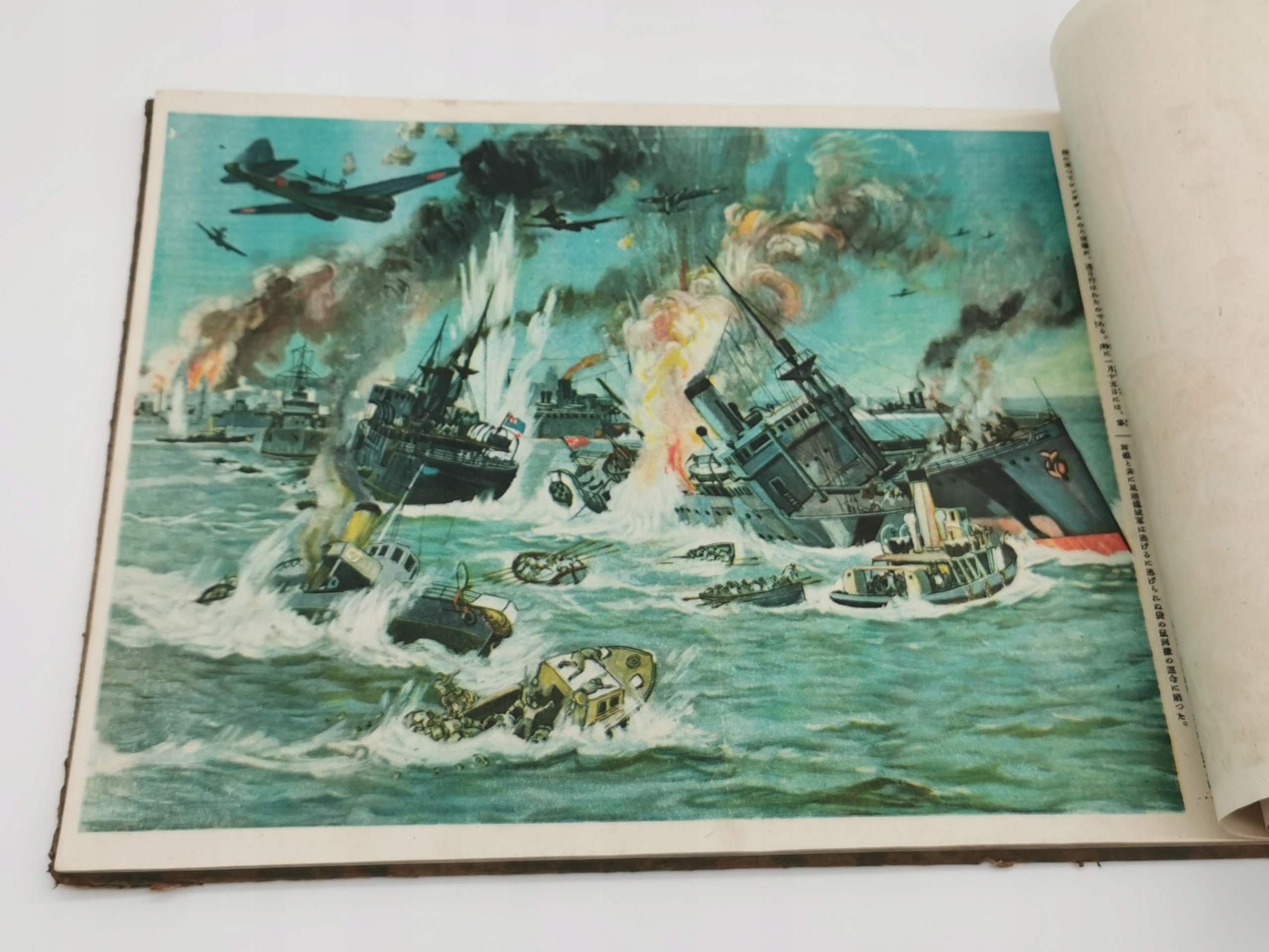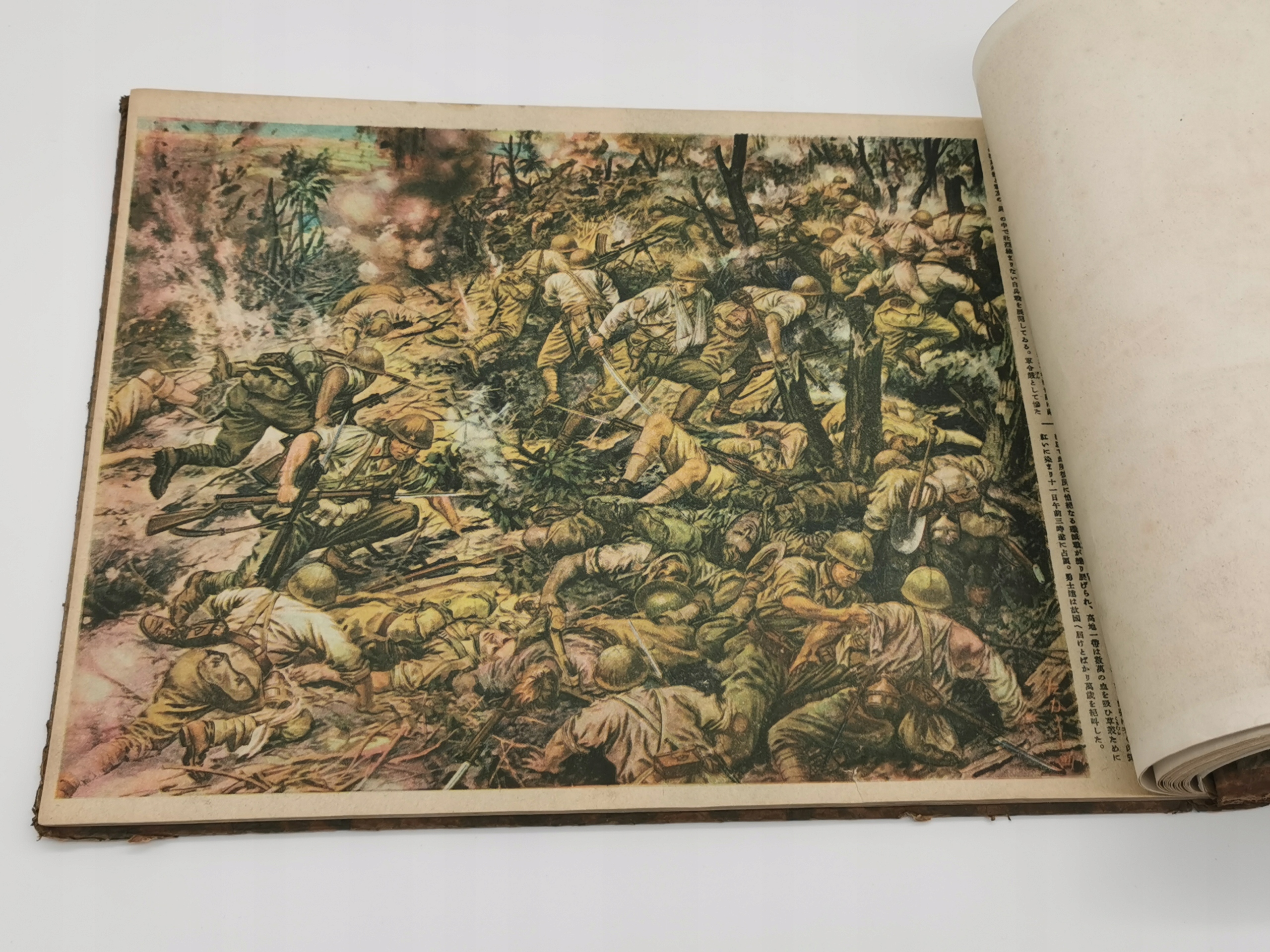 Продается японский альбом 1953 года, на котором показаны батальные сцены японо-англосаксонских столкновений во время Второй мировой войны 1942 года. Красочные изображения отражают реализм боевых действий, показывают редкие сцены многочисленных капитуляций англосаксонских войск и подчеркивают мощь японской армии. Удивительные жанровые сцены с участием различных родов войск – от флота до авиации, пехоты и вспомогательных войск – демонстрируют жестокость этого конфликта на его начальной стадии. В альбоме 40 иллюстраций, 8 из них слегка порваны, как видно на некоторых фотографиях, пробелов нет, возможна реставрация, но на ценность исторического материала это не влияет. Изделие может стать прекрасным подарком любителю Второй мировой войны и живописи. Интересное, уникальное историческое предложение для зимних вечеров.