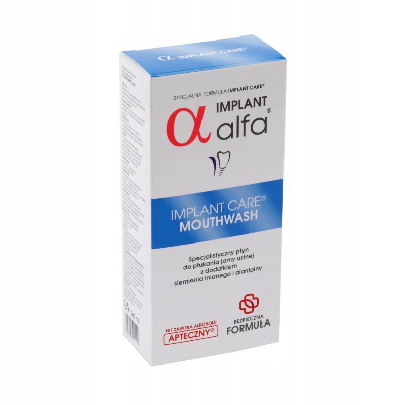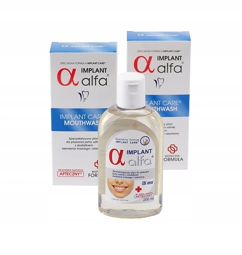 ALFA IMPLANT 200 мл стоматологический антибактериальный ополаскиватель для рта с добавлением льняного семени и аллантоина.